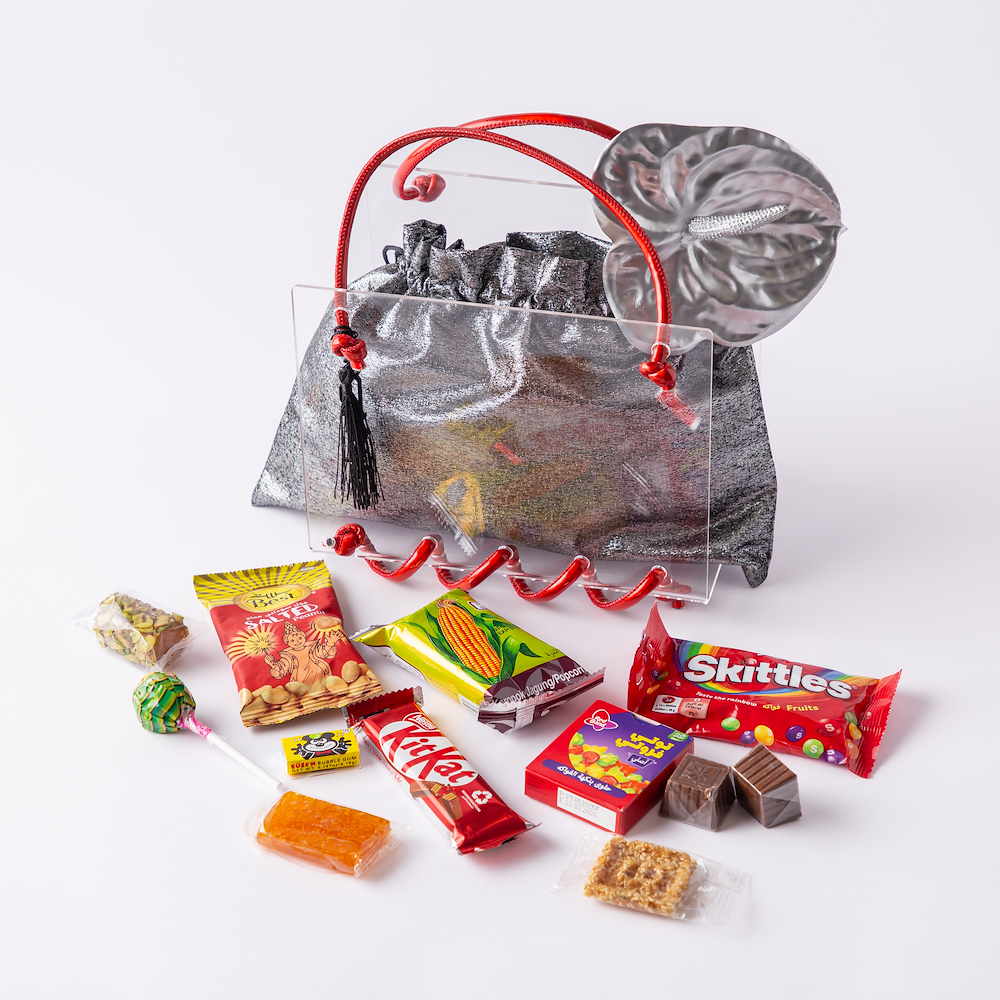 Gergeaan bag contains sweets with an acrylic box and artificial flowers.