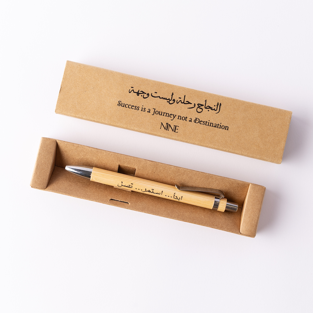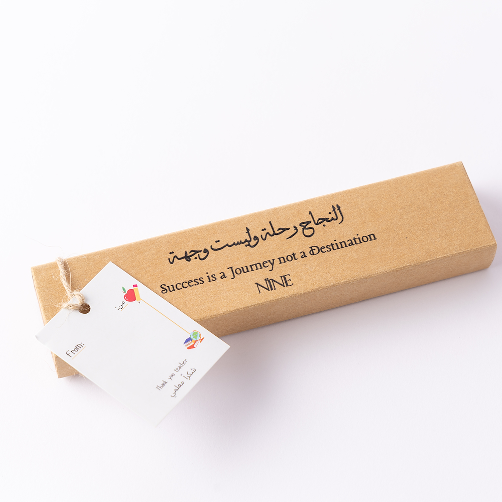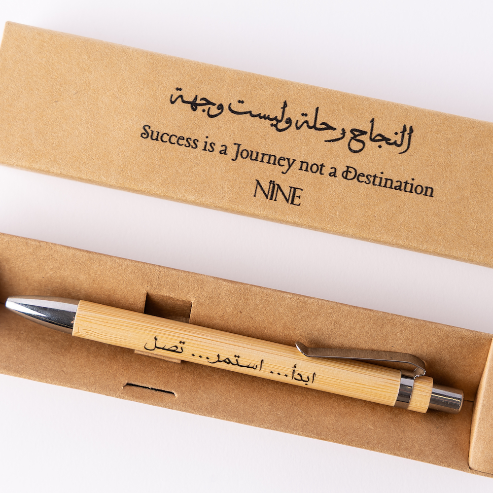 A Teacher’s Day gift featuring a fountain pen engraved in Arabic with the phrase: Start, Continue, Arrive.