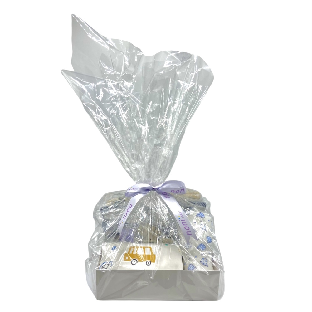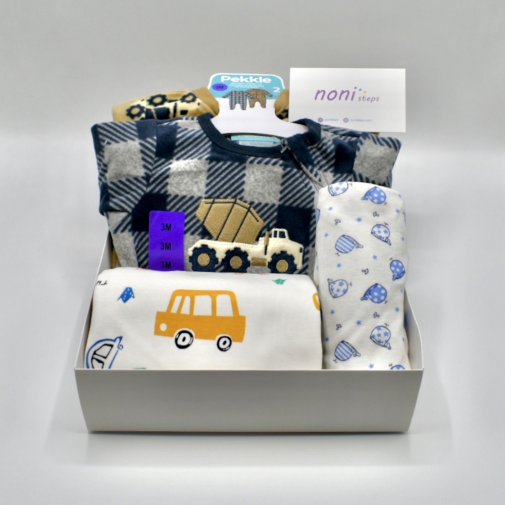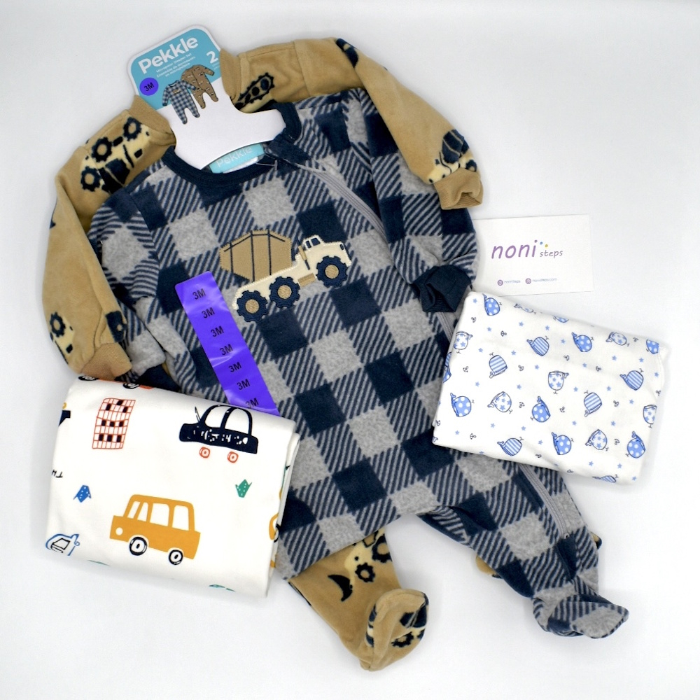 This set includes 2 soft winter sleeping suits with a zipper, a baby changing mat with a car print (50cm x 70cm) made of cotton, PUL, and bamboo fiber, and a blue whale swaddle wrap, made of 100% organic cotton, this set is suitable for a 3 month old baby.