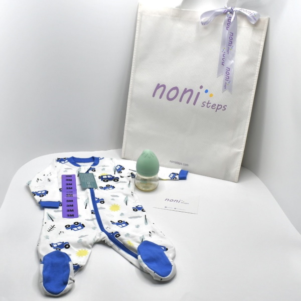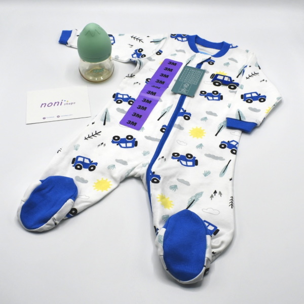 This sleeping set contains a sleep suit with a zipper made of 100% cotton and a 90ml green baby bottle. This set is suitable for a 3 month old kids.