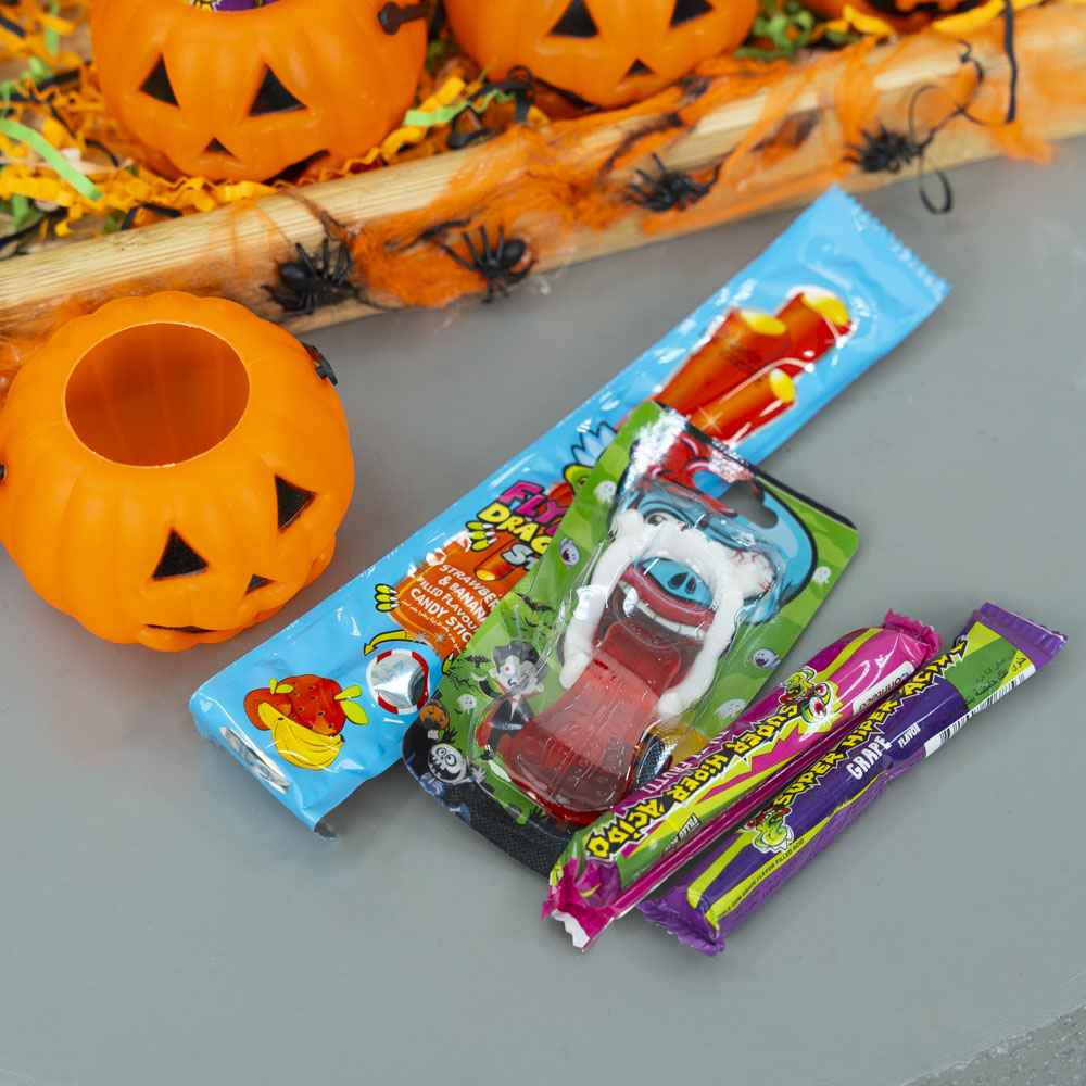 Halloween themed wooden tray with 12 boxes of 4 sour fruit candies each.