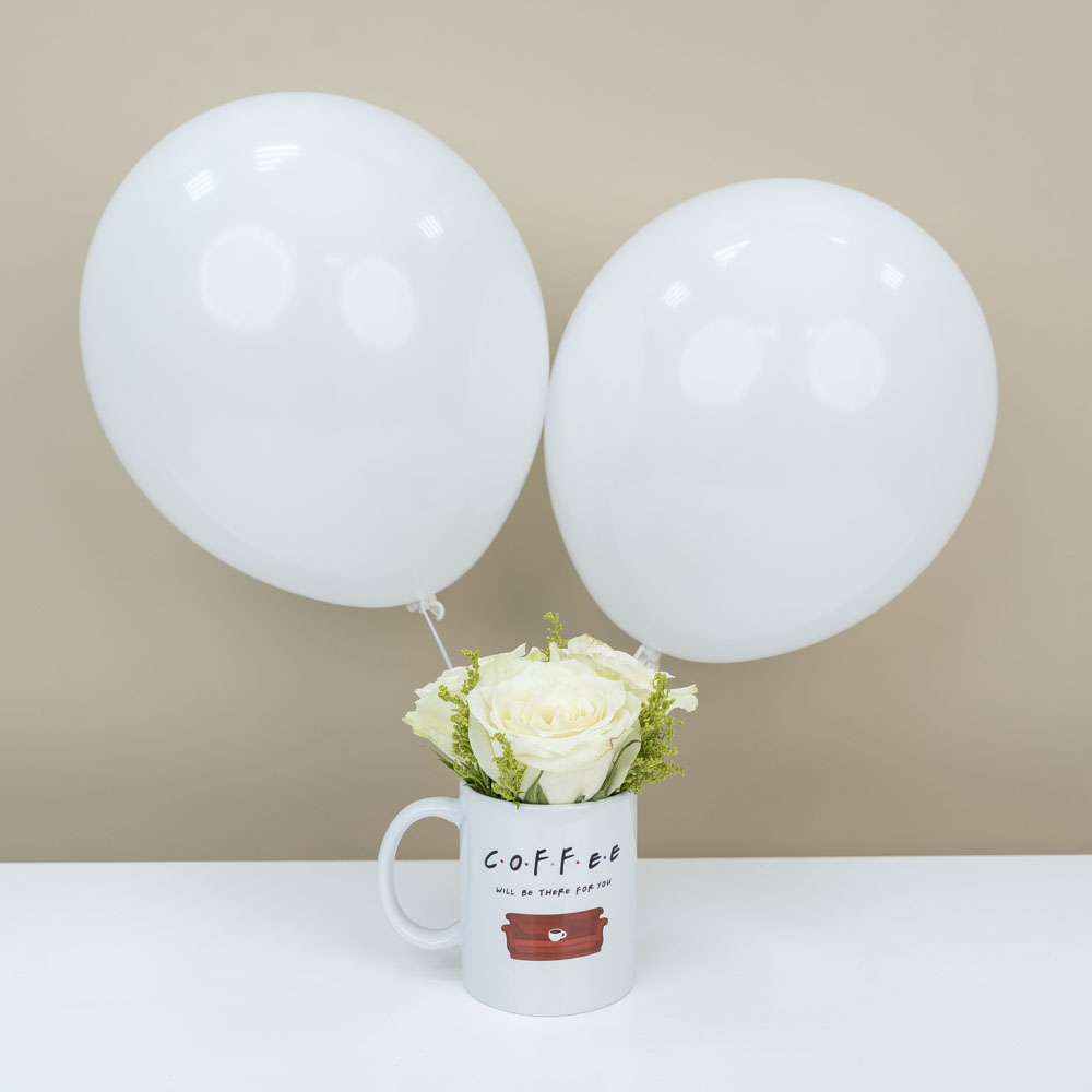 A ceramic mug decorated with 3 roses and 2 balloons.