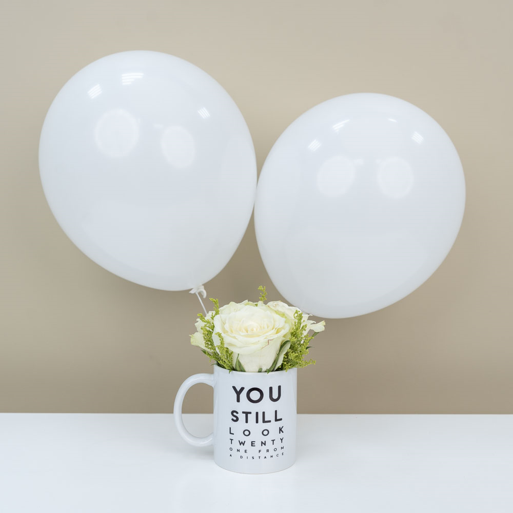 A ceramic mug decorated with 3 roses and 2 balloons.