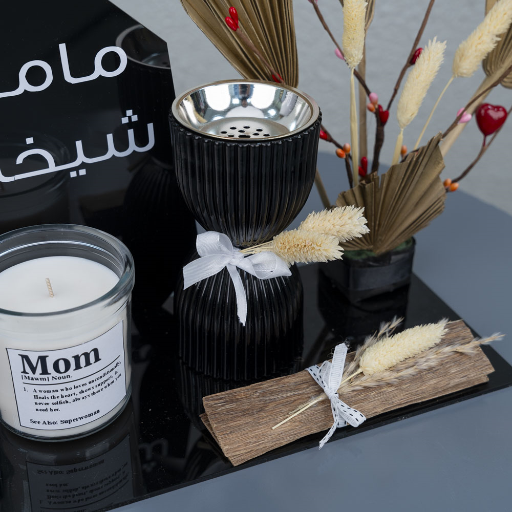 An acrylic tray decorated with dried flowers containing a vanilla-scented candle, an incense burner, and a piece of Vietnamese incense.