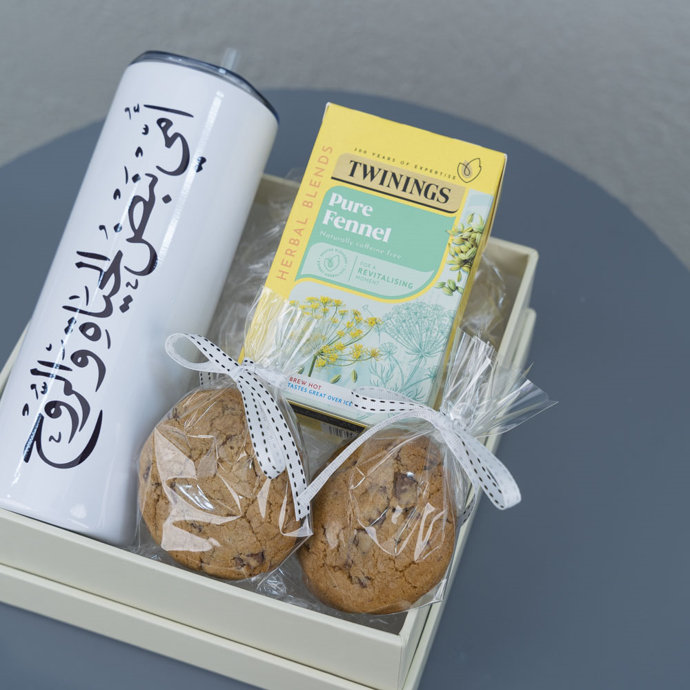 A box containing a stylish thermal mug, two chocolate chip cookies, and a tin of fennel tea.