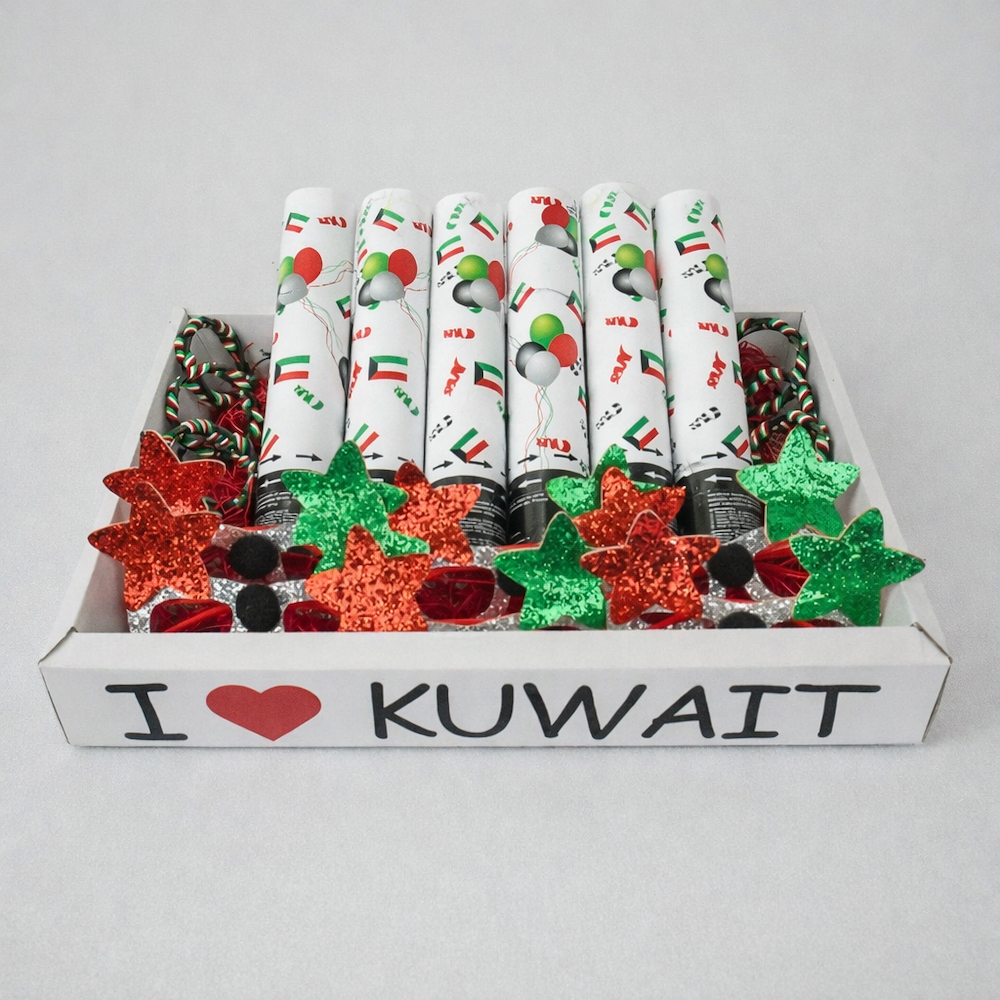 A large, customized tray with the phrase "I Love Kuwait" arranged with 6 Kuwait-themed party poppers, 6 Kuwait-colored eyeglasses, and 6 Kuwait leather bracelets.