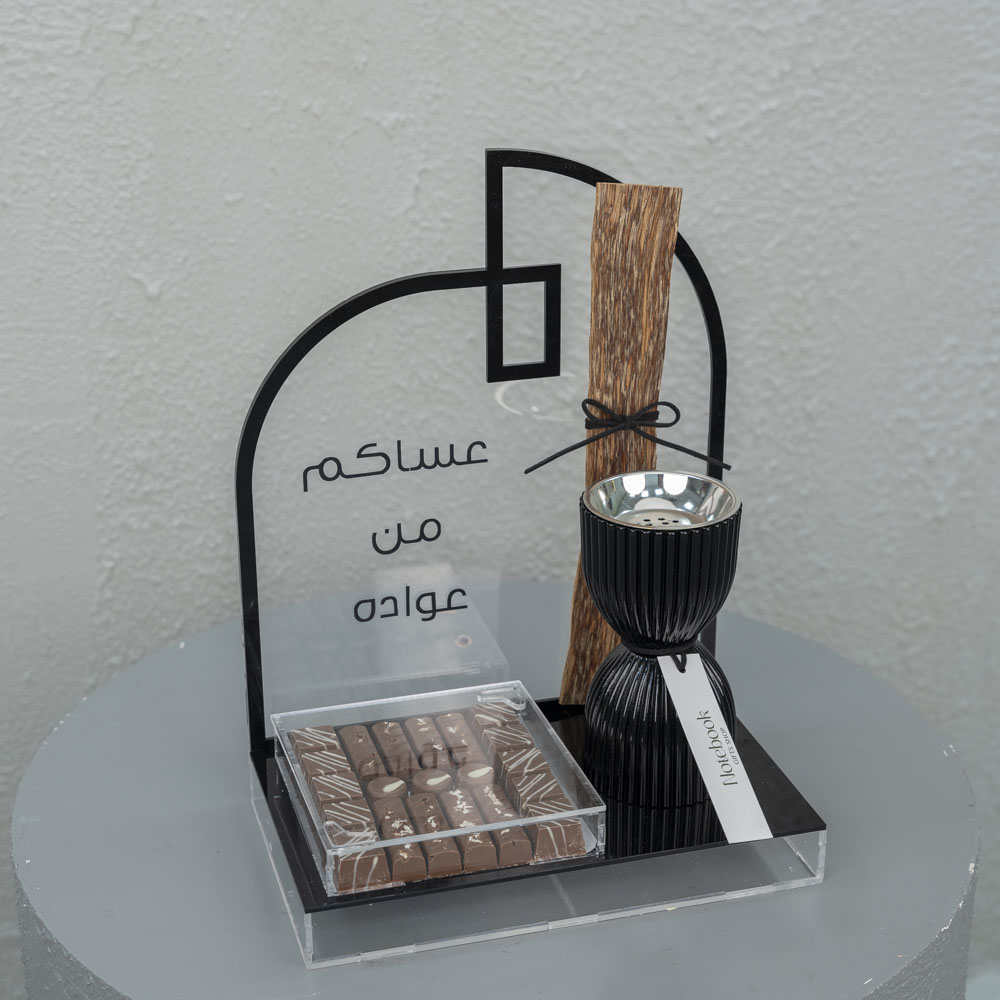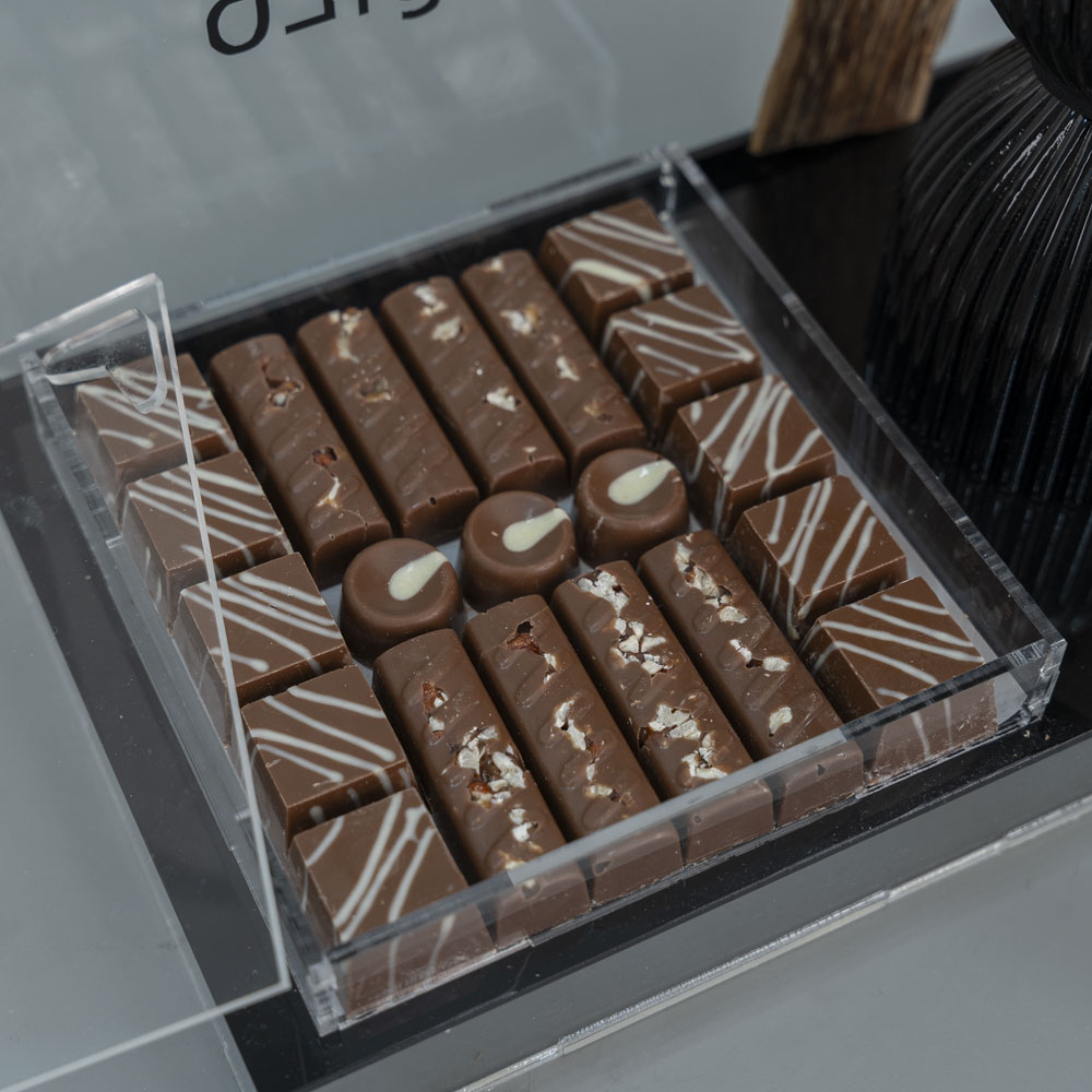 Acrylic holder containing Belgian chocolates with multiple fillings, along with an incense burner and a piece of Malaysian incense.
