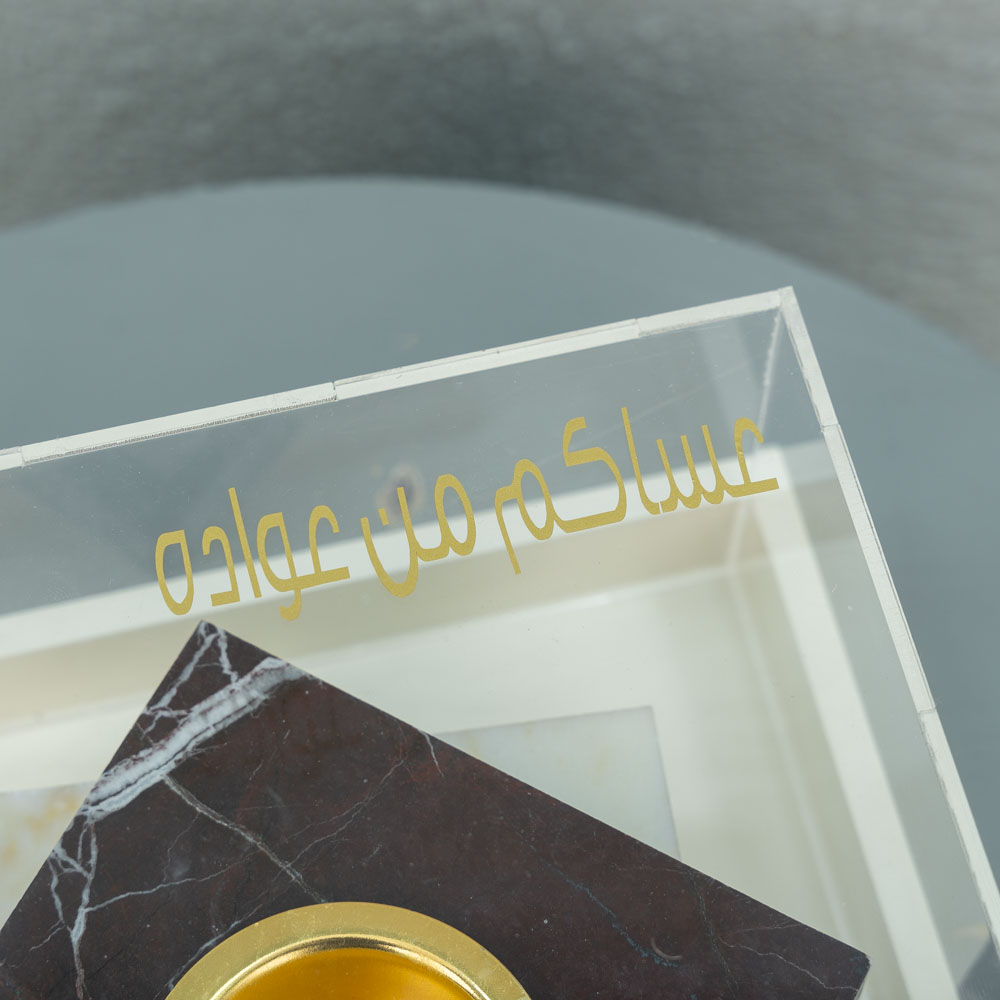 A wooden tray with an acrylic lid containing a luxurious marble incense burner.