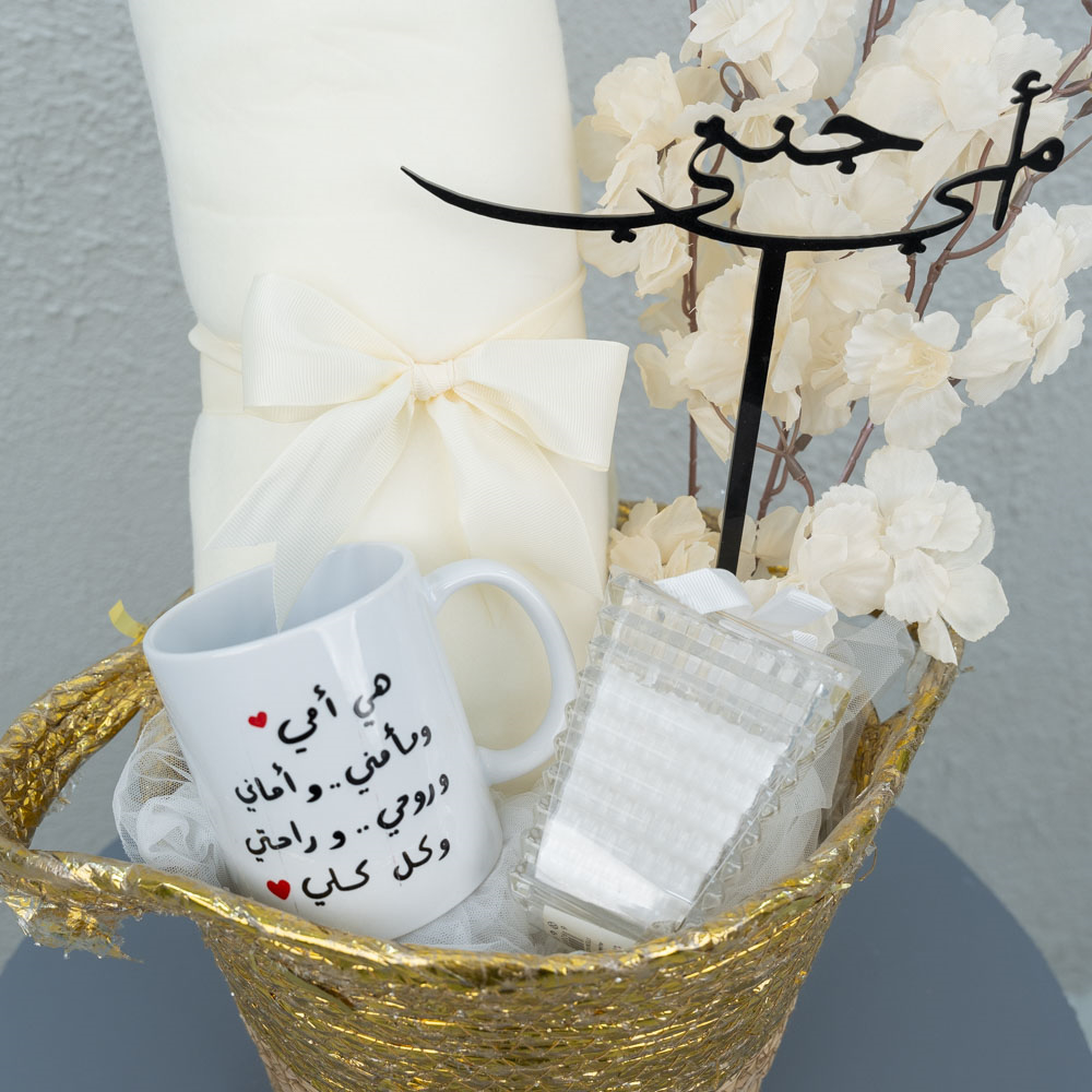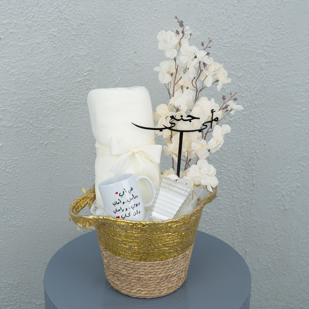 An elegant basket featuring artificial flowers, a blanket for one person, an incense burner, and a cup.