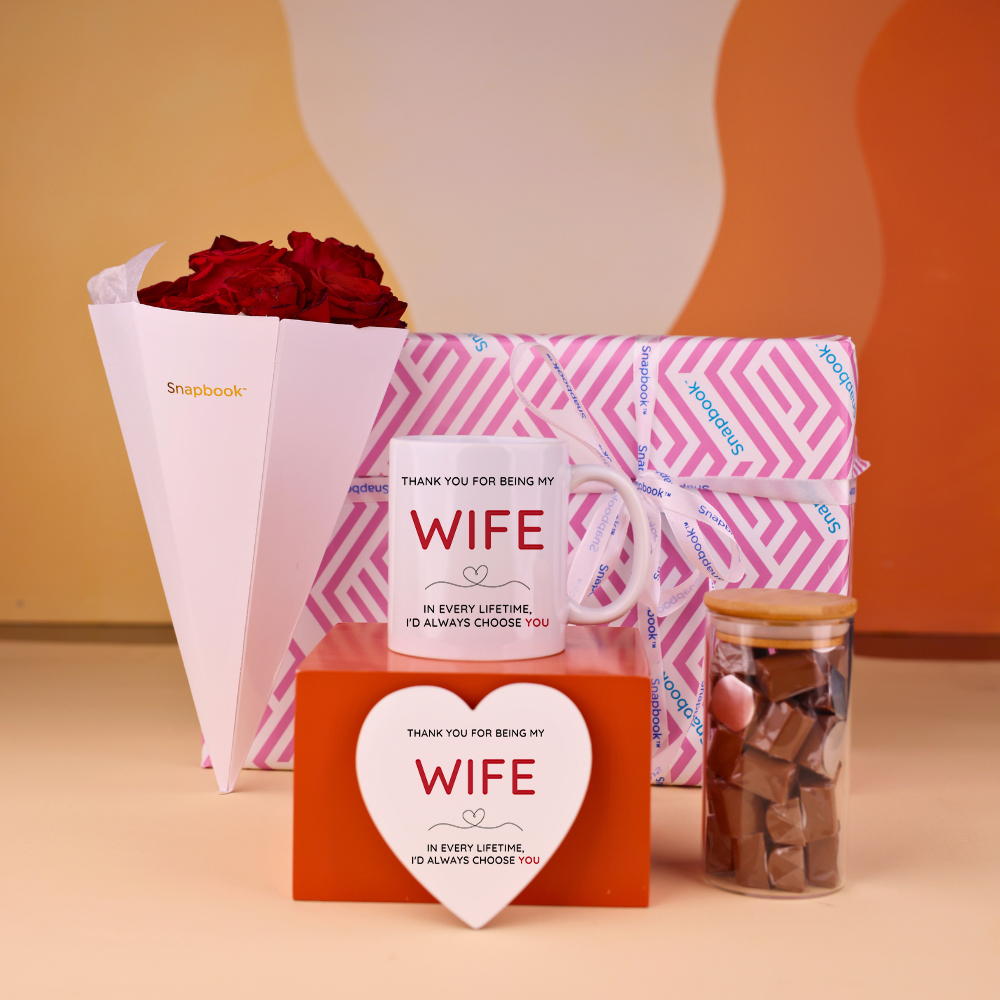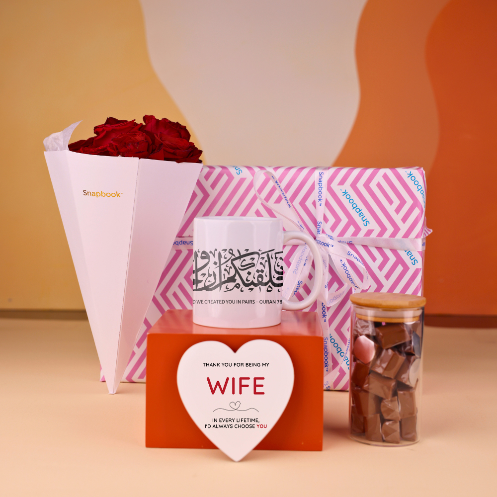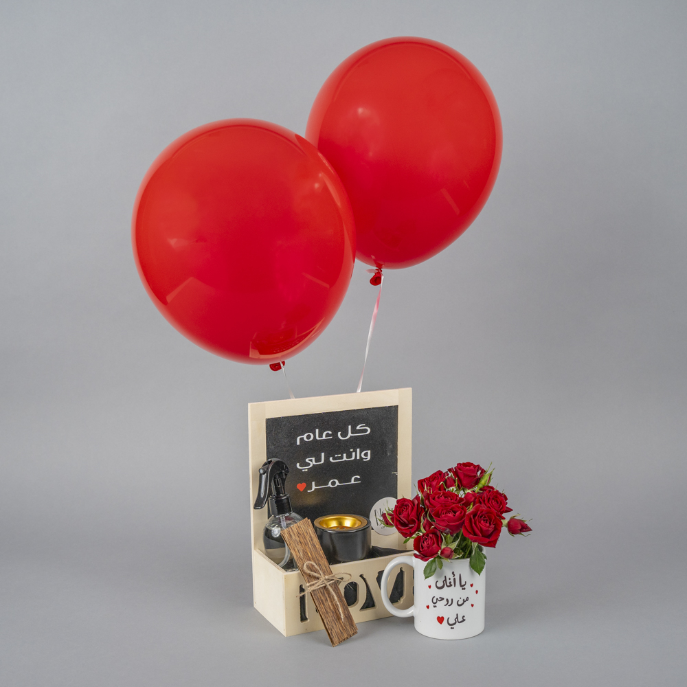 Wooden box contains a mug with flowers, room spray, Vietnamese bokhour and mubkhar.