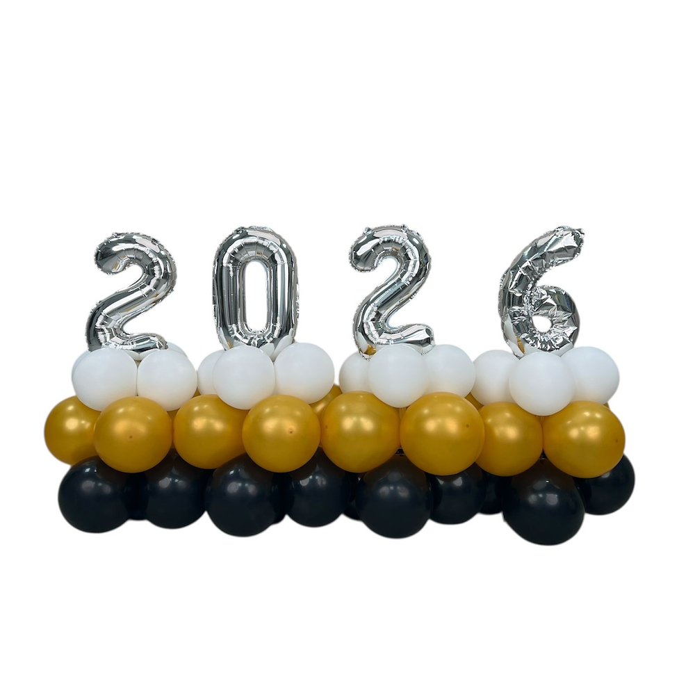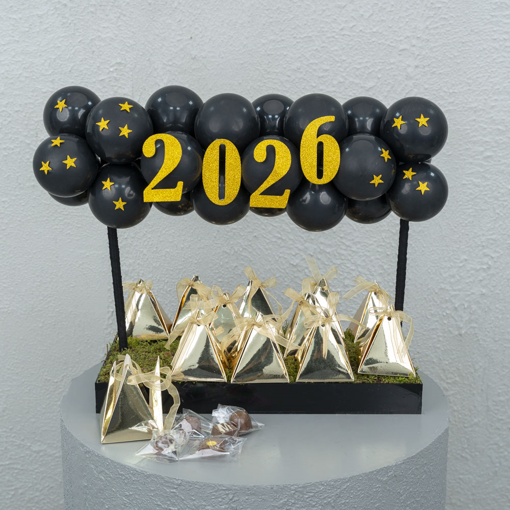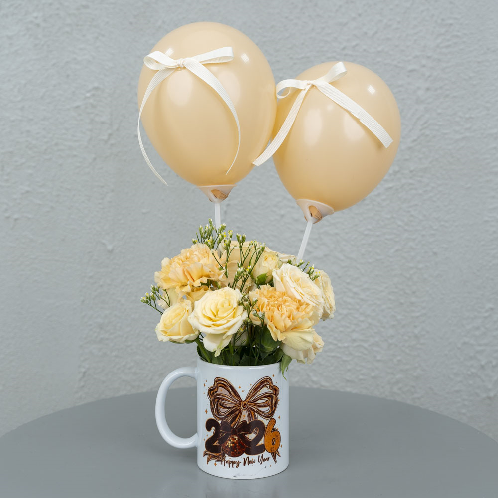 A thermal mug, decorated with two balloons and a few baby roses, containing a collagen mask, a lipstick, a mascara, a mirror, and a natural soap with a lavender scent.