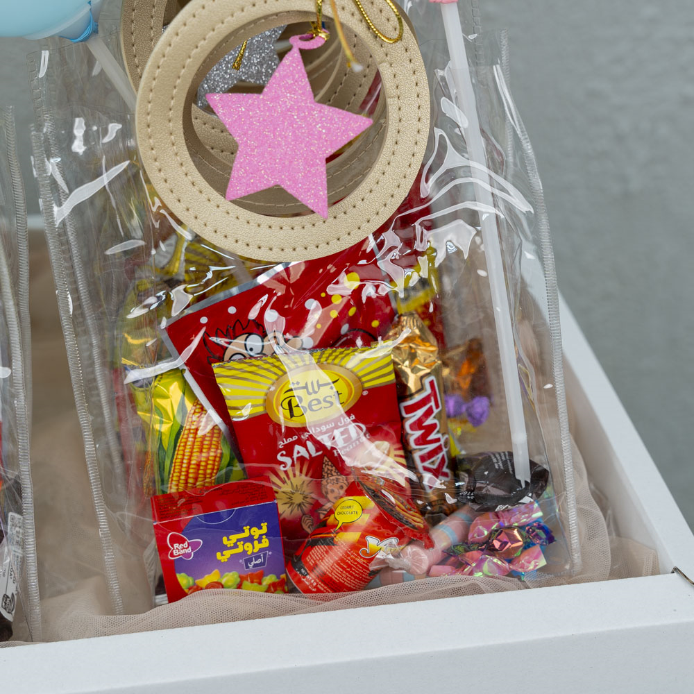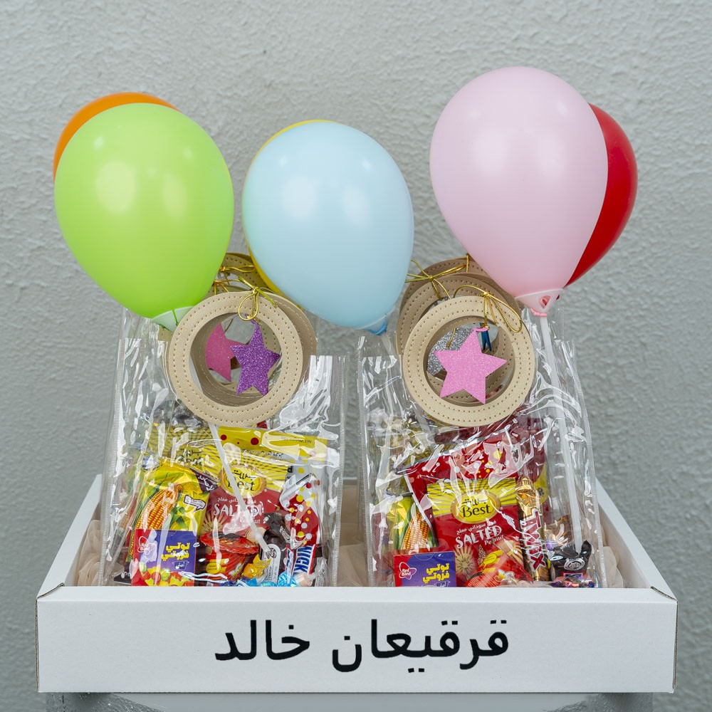 An elegant wooden tray bouquet, featuring 6 bags filled with Gergean sweets, each with a balloon.