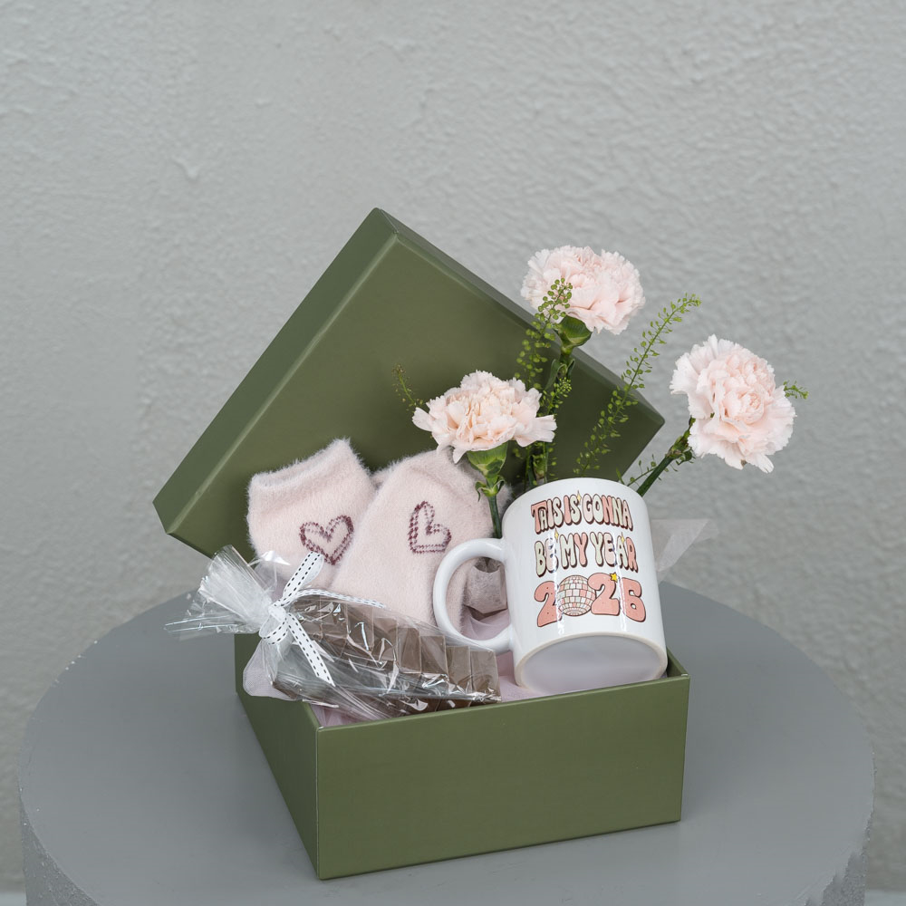 A box decorated with 3 carnation flowers containing a mug, a pair of socks, and 8 Belgian chocolates with a wafer filling.