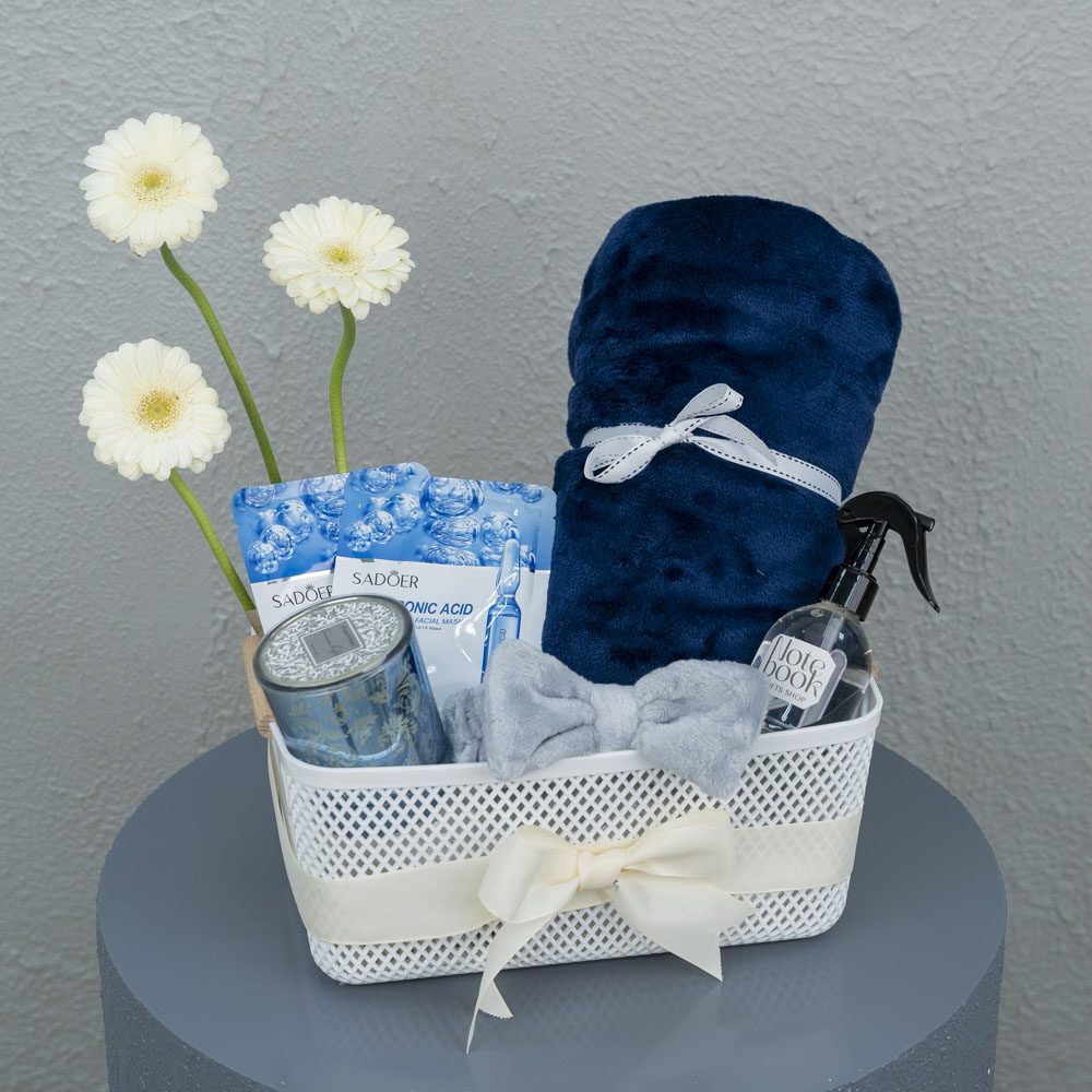 A basket designed with balloons that contains a blanket, head band, room spray and a mug designed with flowers. You can customize the name on the mug.