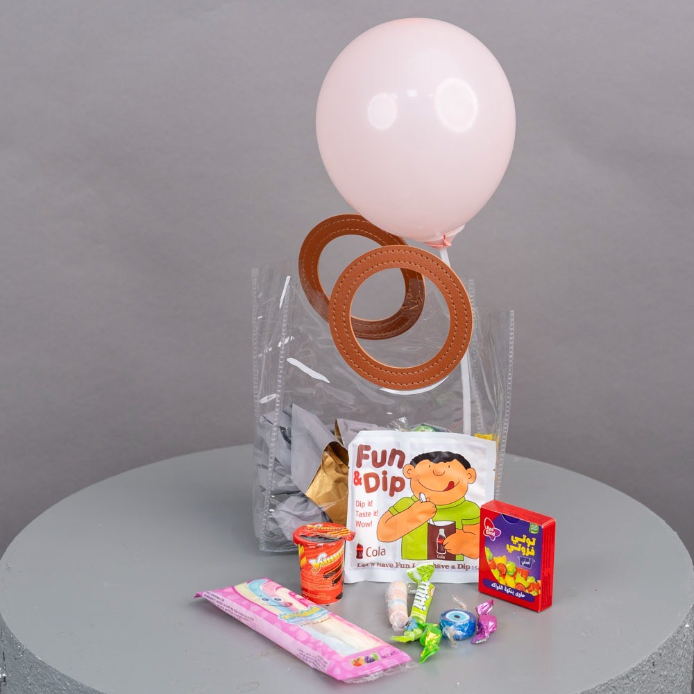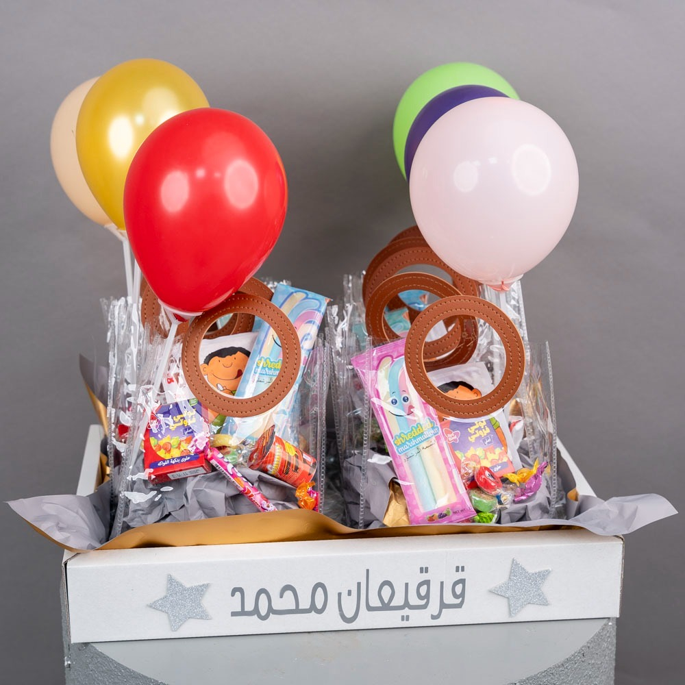 A customized giveaway tray with your preferred writing containing 6 Gergeaan boxes with candies, chocolates, and balloons.
