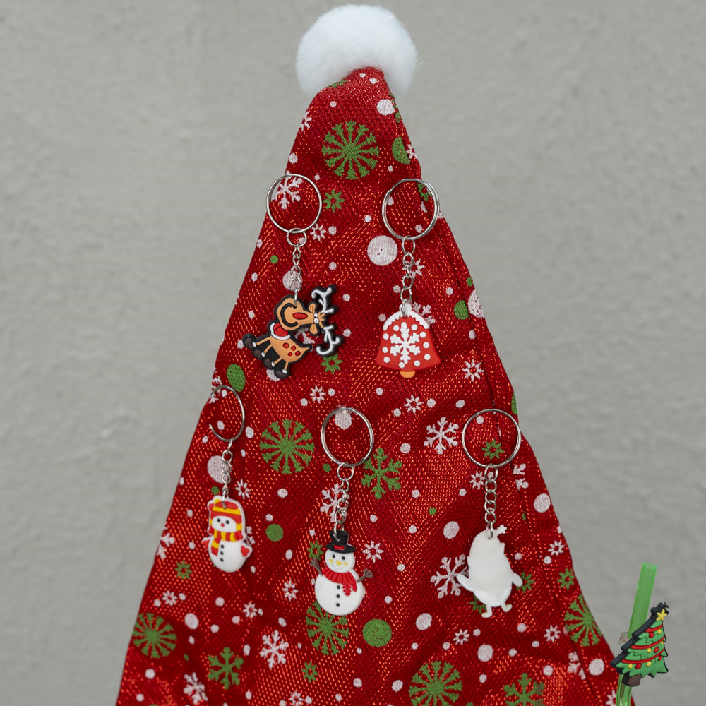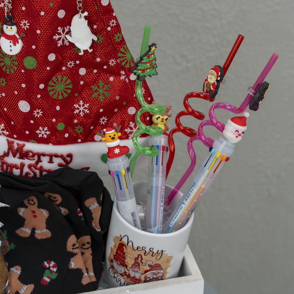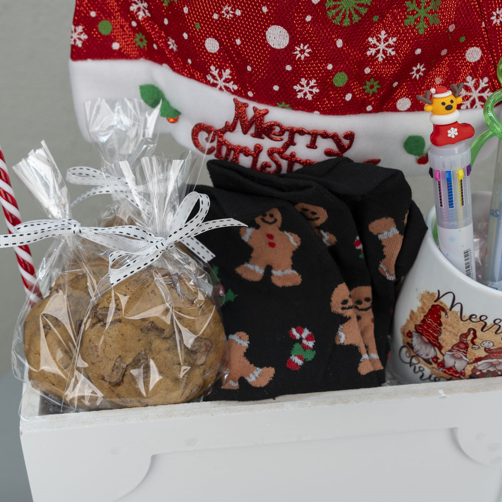 A wooden box that contains a Christmas hat for decoration, 5 pieces of random keychains, 3 pieces of chocolate chip cookies, 1 pair of socks, a mug, 3 pieces of straws and 3 pieces of pens.