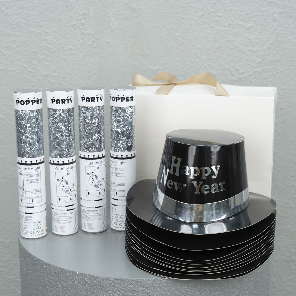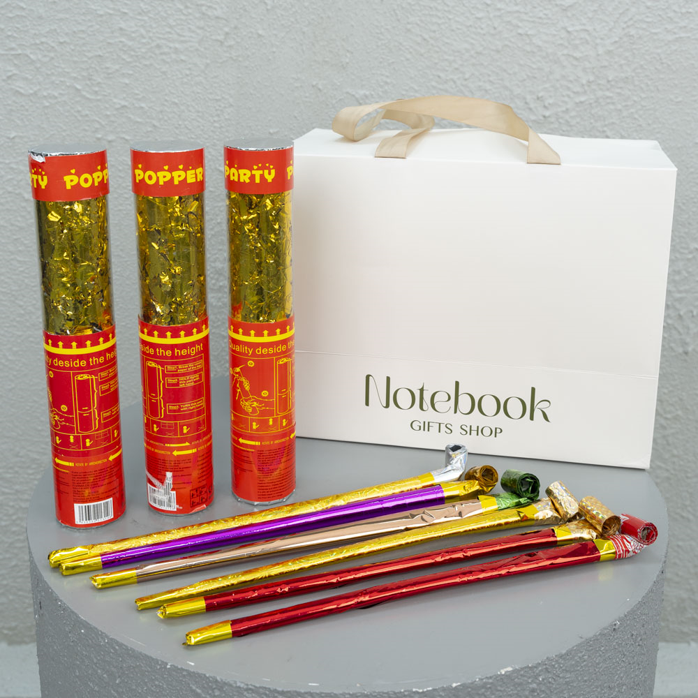 A bag that contains 3 party poppers and 6 party whistles.