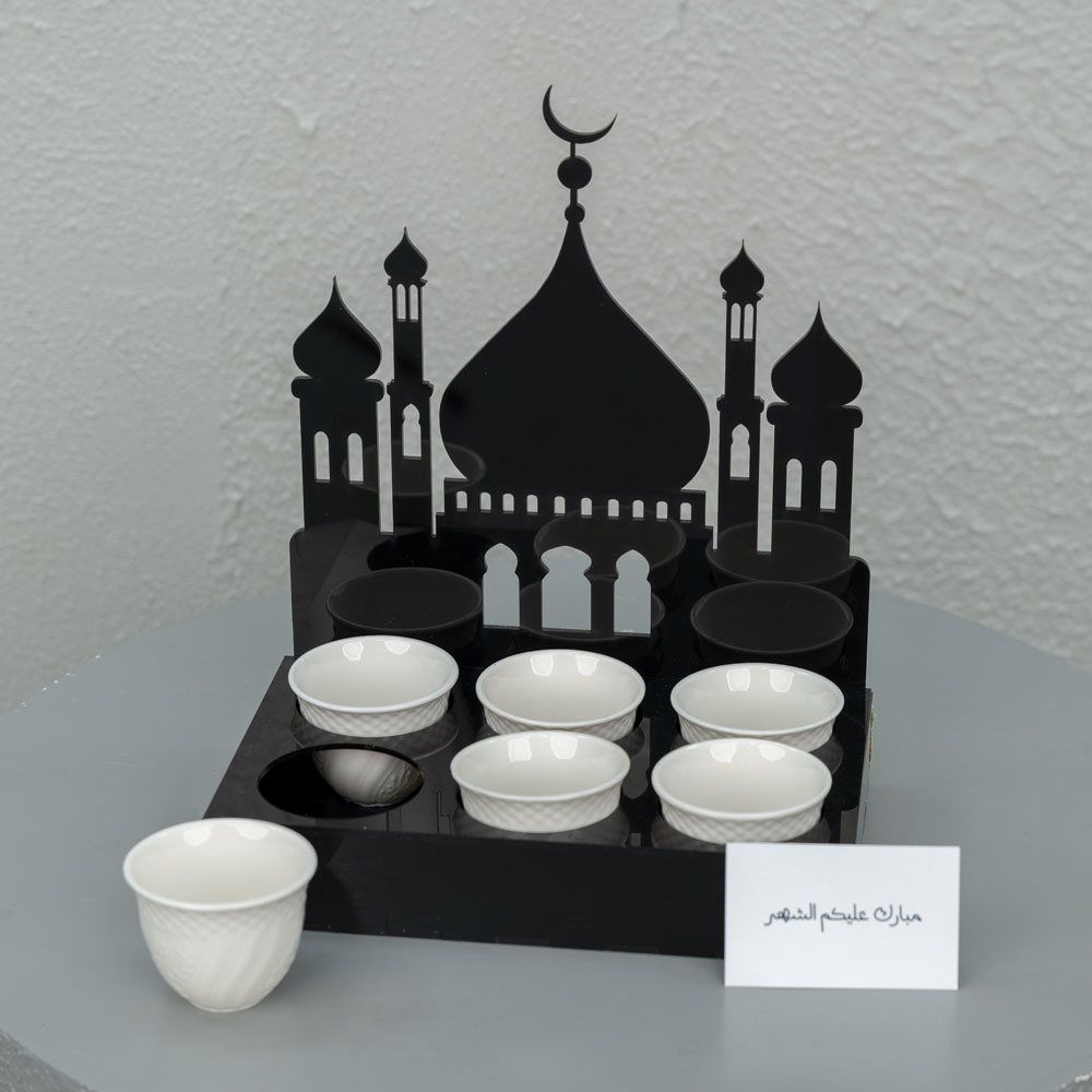 Wooden tray with mug filled with Belgium chocolates, money box decorated with flowers. Note: does not include money notes