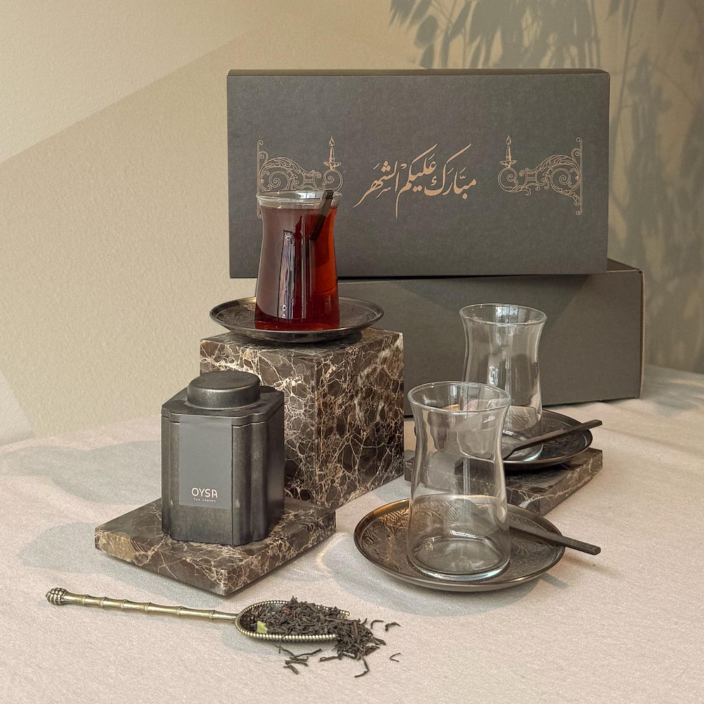 A tea gift set, a timeless tradition, featuring 6 classic tea (istikana) glasses, 6 handmade ornate plates, 6 delicate spoons, and 2 vintage boxes of Sri Lankan tea, a gift of warmth, culture, and quiet joy.