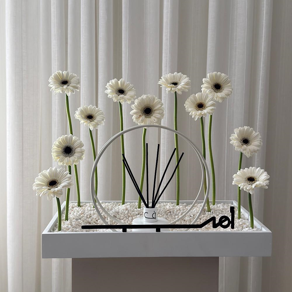 A special mother's day arrangement featuring fresh white gerbera daisies, a stylish Arabic “Mom” sign, and elegant circular accents. Includes a luxurious 100ml perfume bottle that can be customized with one Arabic letter for a personalized gift touch.