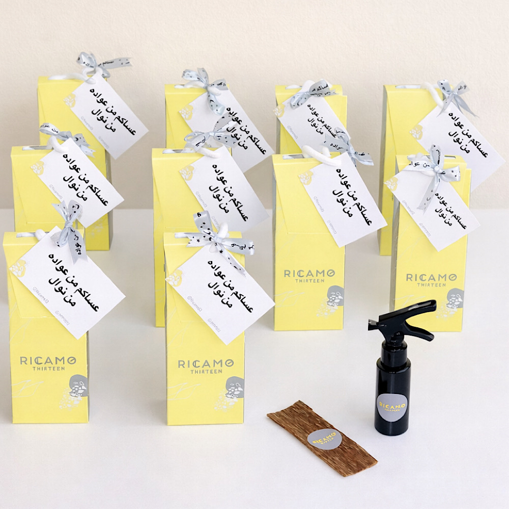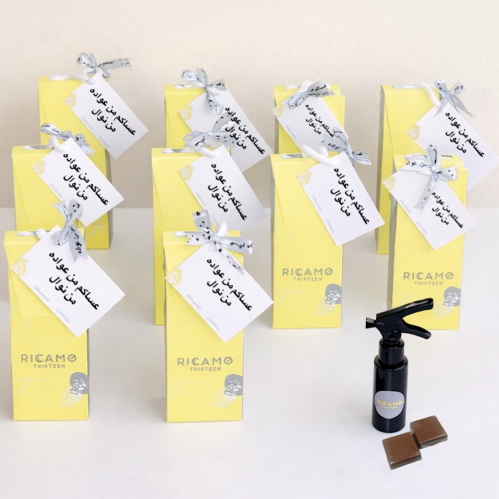 This special gift set contains a pray mat with, chocolates, mubkhar, and a home spray, arranged on a stand decorated with flowers and names customization on it.
