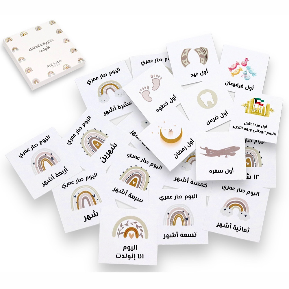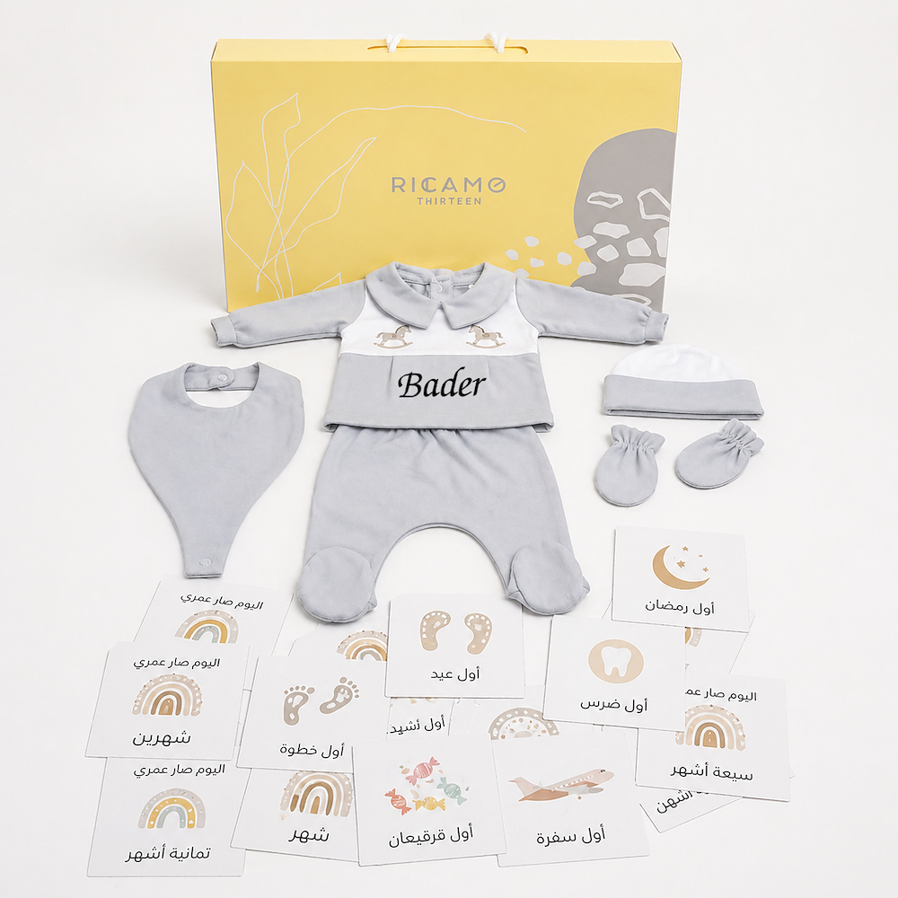 A special gift for new baby suit, cap, bib, gloves with name embroidery, the set size 0/3 months, comes with photography cards for the child's monthly stages and occasions to photograph the stages of the child month by month and take special pictures and memories for the child's first year, a set of 20 cards with a special gift wrapping.