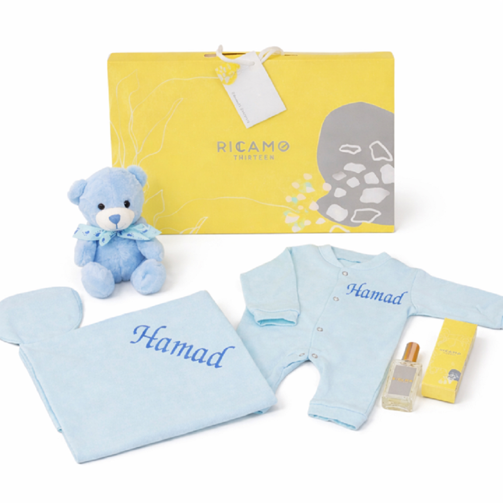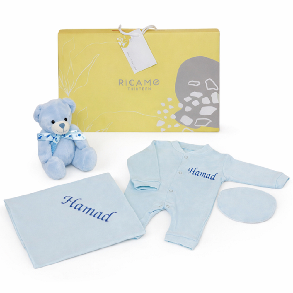 This gift set contains a baby mat with a pillow. Name can be embroidered in English or Arabic. Comes with special gift wrapping.