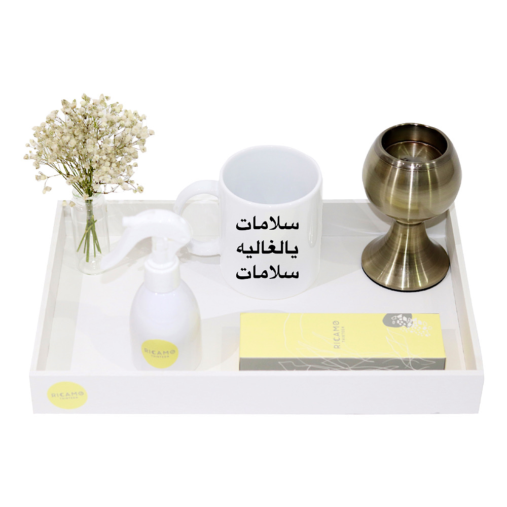 This special gift set contains an incense burner and a spray with chocolates and a mug with printing and flowers. Comes with special gift wrapping on a wooden tray.