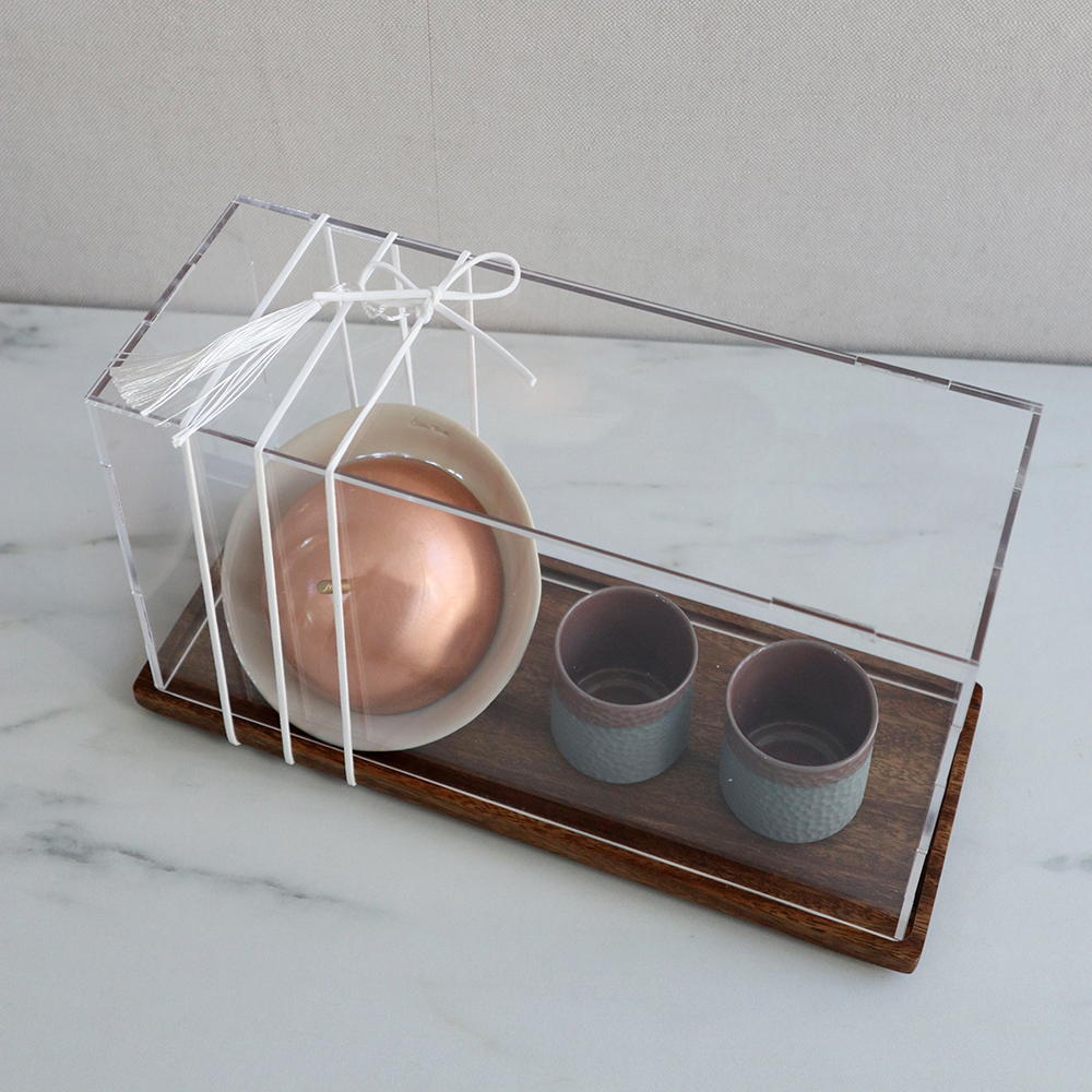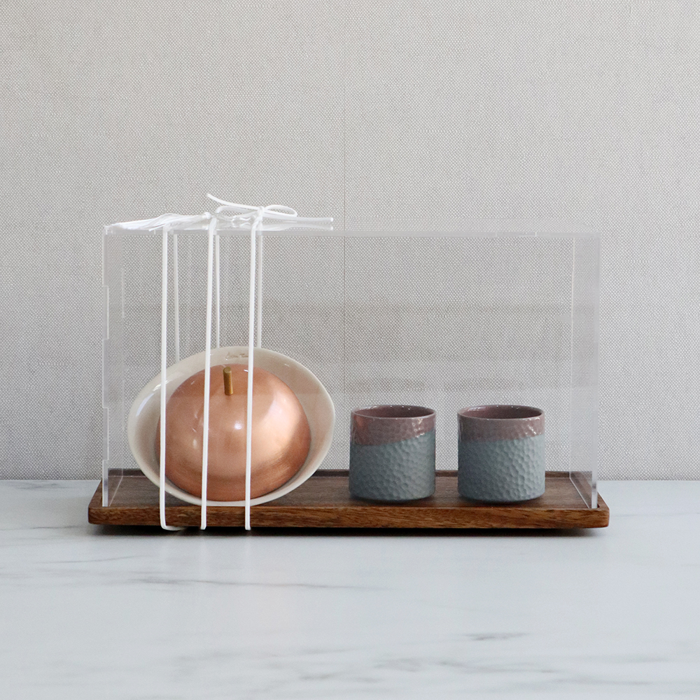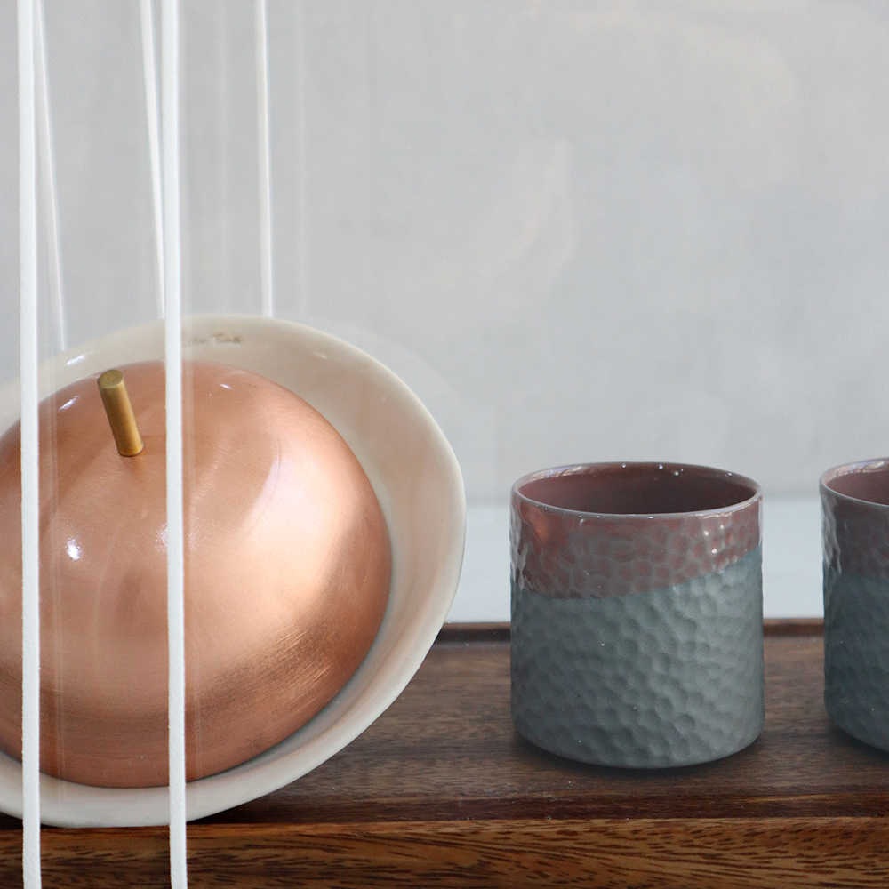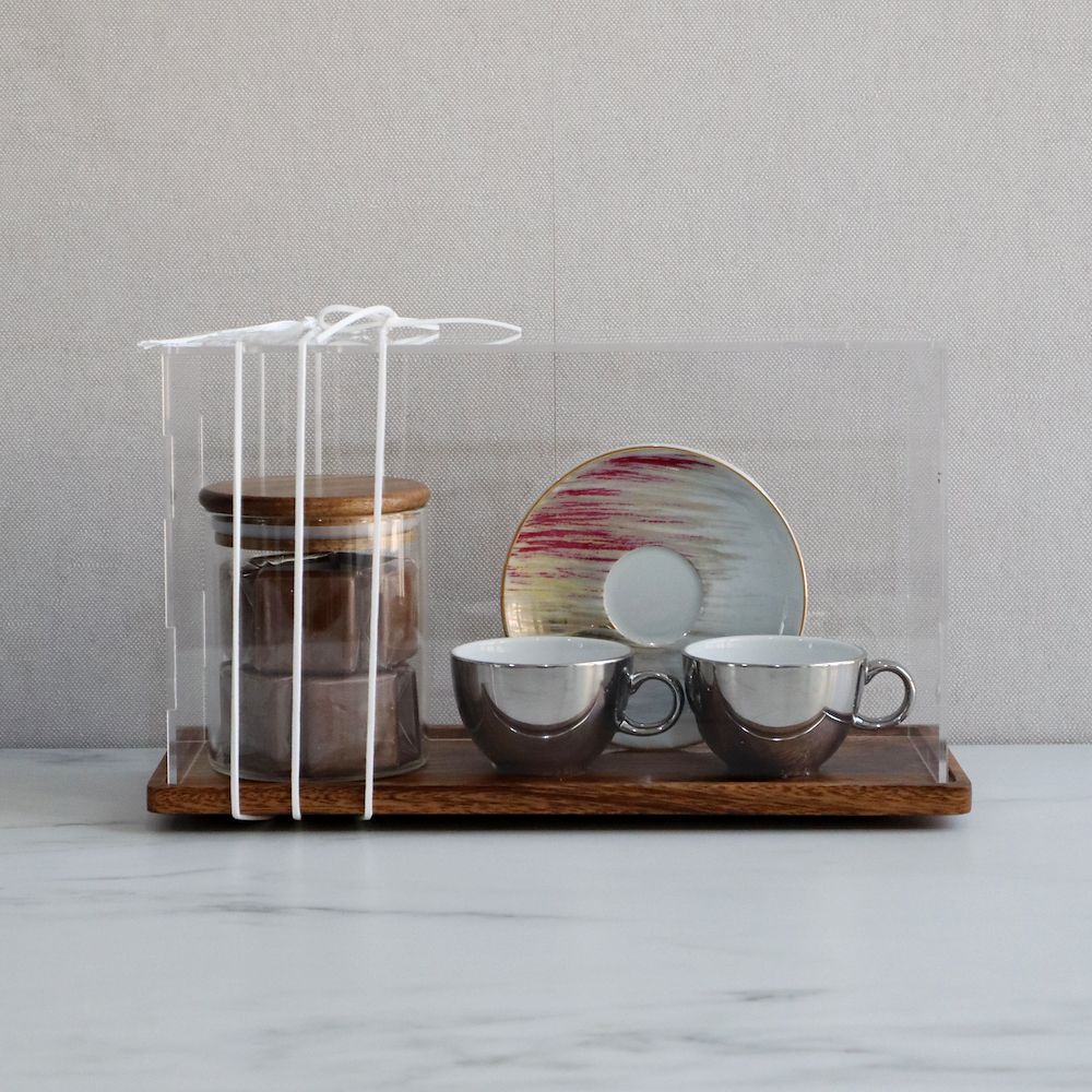 A warm and elegant set made for hosting and everyday moments, this serving set features 2 handcrafted porcelain cups paired with a rose gold serving dome, perfect for presenting dates, nuts, or small desserts alongside your coffee. Suitable for espresso or Arabic coffee, whether for guests or personal rituals at home. Cup: 5 × 5 cm (75 ml). Plate: 11.5 cm.