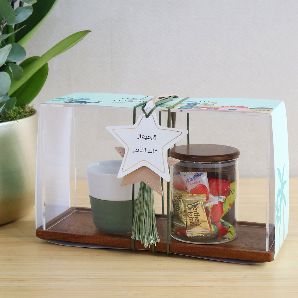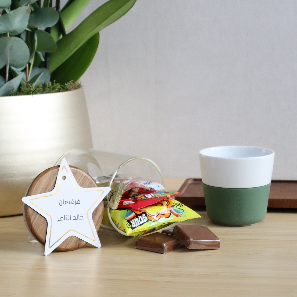 A (Little Star) Gergean set includes an elegant tray crafted from oak wood, a glass jar with a wooden lid filled with sweets, and a tea or coffee cup from the Danish brand Eva Solo. The set features a beautiful Ramadan-inspired design with a personalized name card upon request, along with a colorful tassel and star charm to decorate bags, making it a fun and special gift for children during the Gergean season.