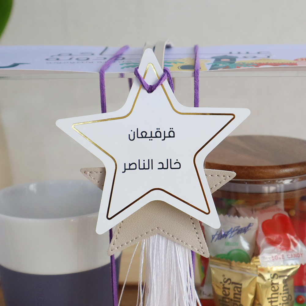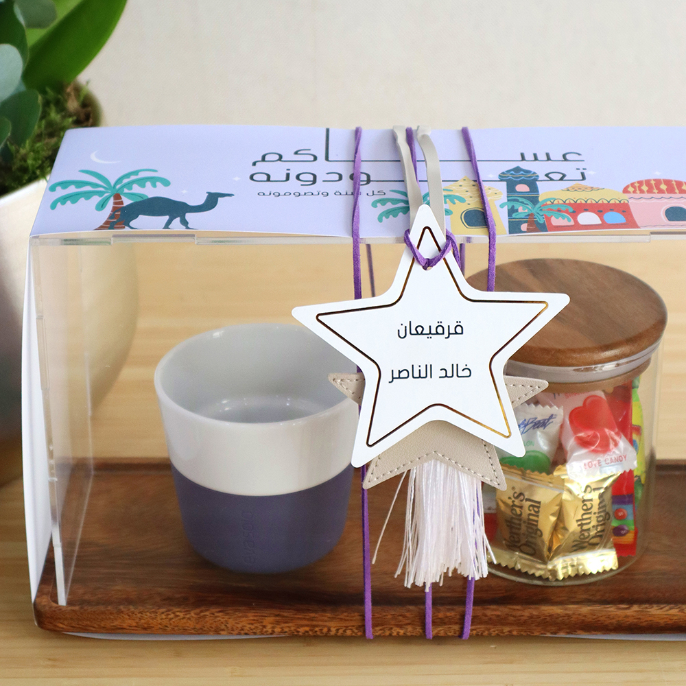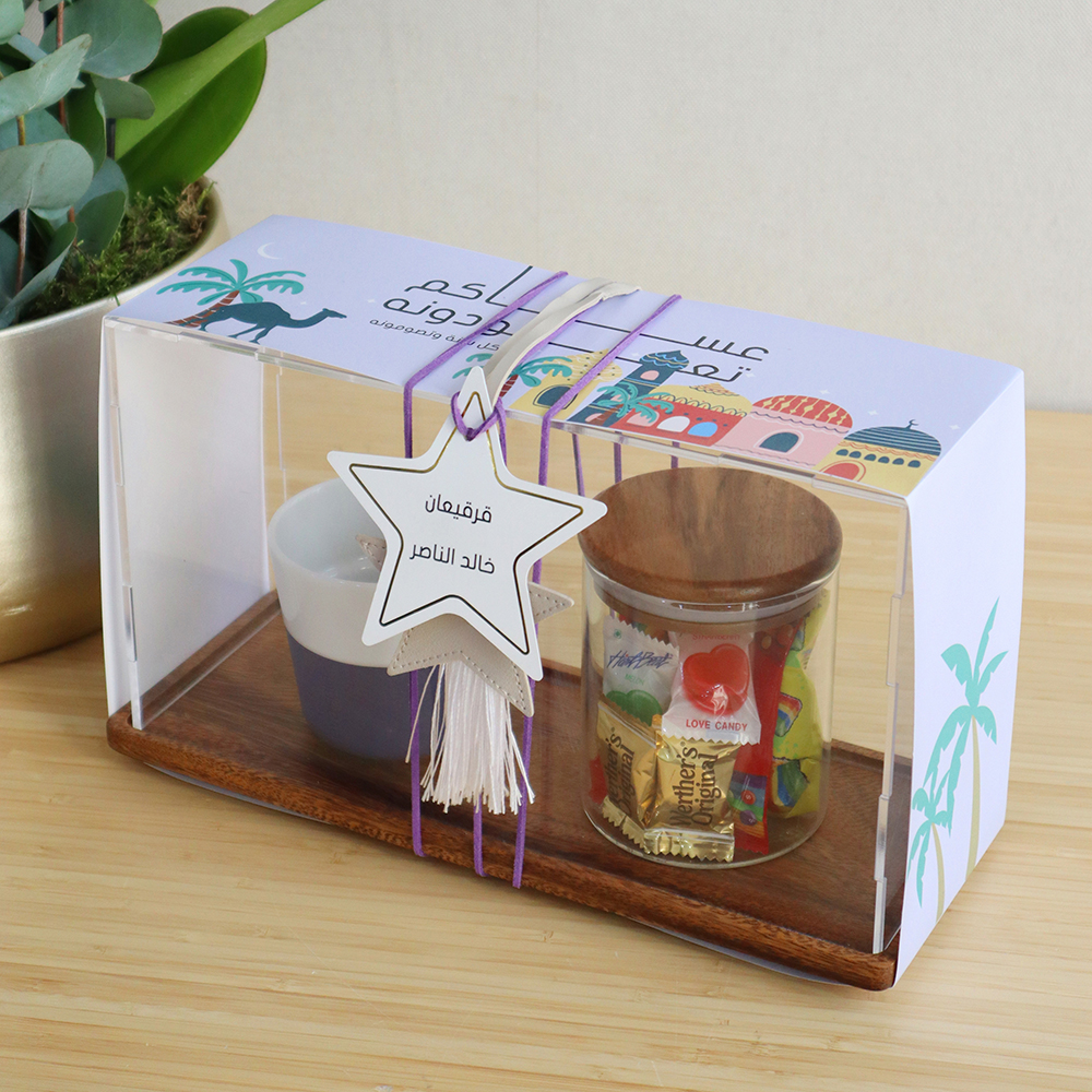 A (Little Star) Gergean set includes an elegant tray crafted from oak wood, a glass jar with a wooden lid filled with sweets, and a tea or coffee cup from the Danish brand Eva Solo. The set features a beautiful Ramadan-inspired design with a personalized name card upon request, along with a colorful tassel and star charm to decorate bags, making it a fun and special gift for children during the Gergean season.