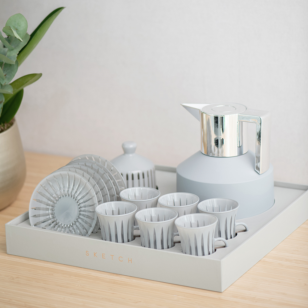 A modern hospitality set designed for balanced, everyday serving, combining sleek Geo design with refined tableware, the set includes a 1l geo vacuum jug to keep beverages hot, a 12-piece tea set for stylish presentation, and a matching sugar jar, making it perfect for elegant hosting or thoughtful gifting.