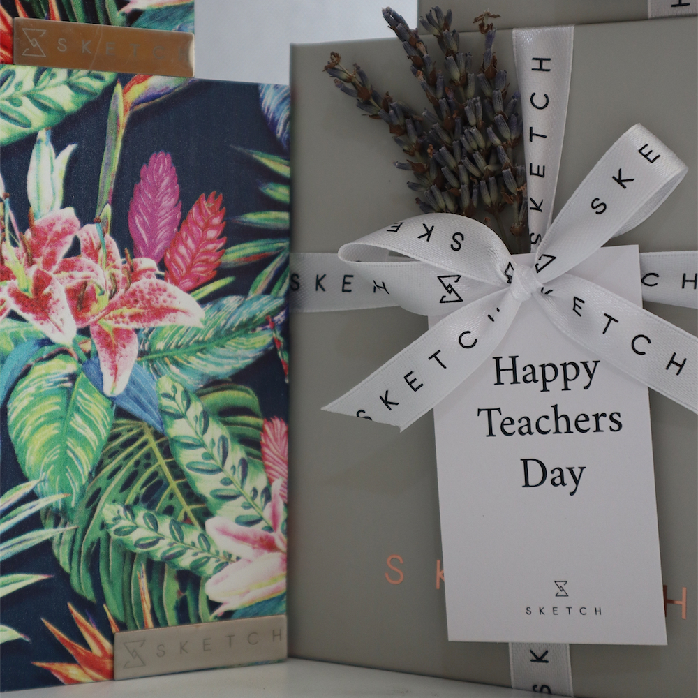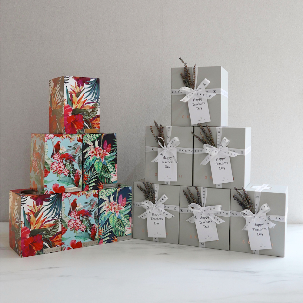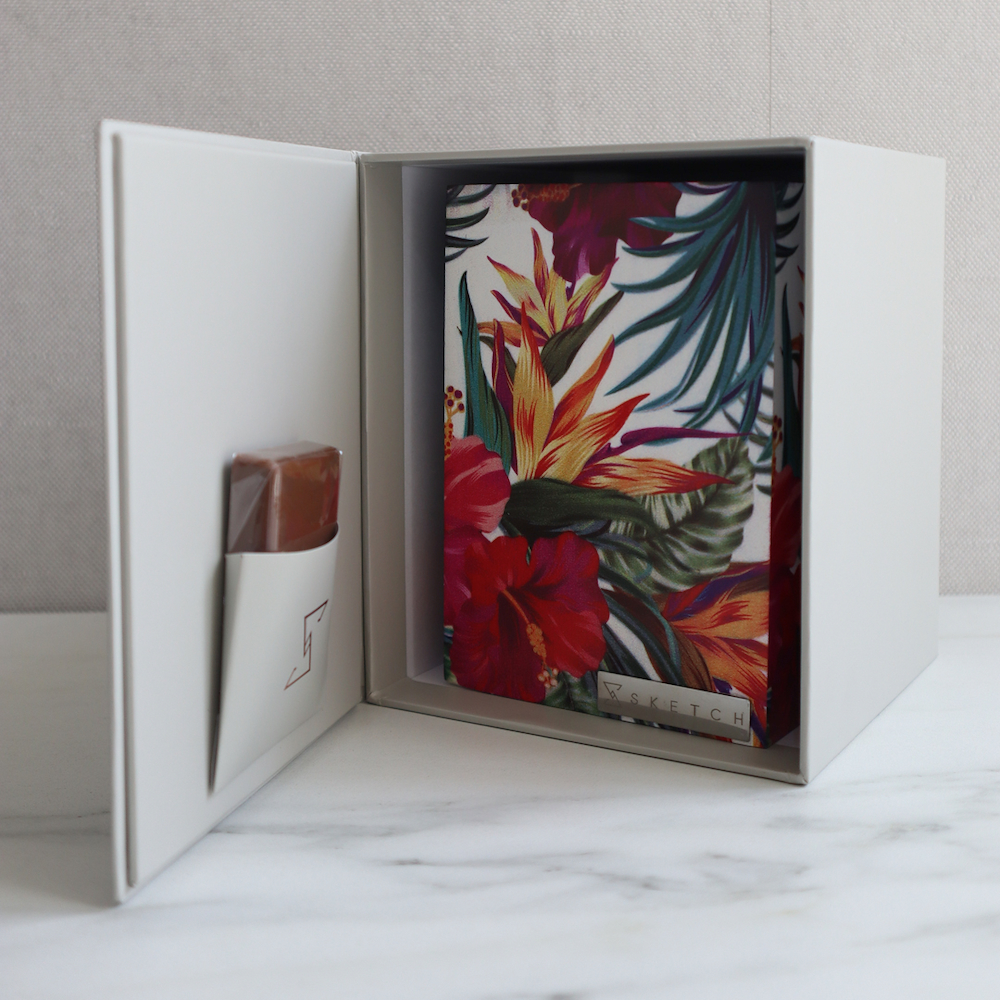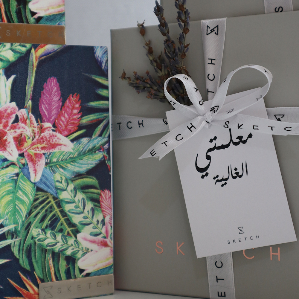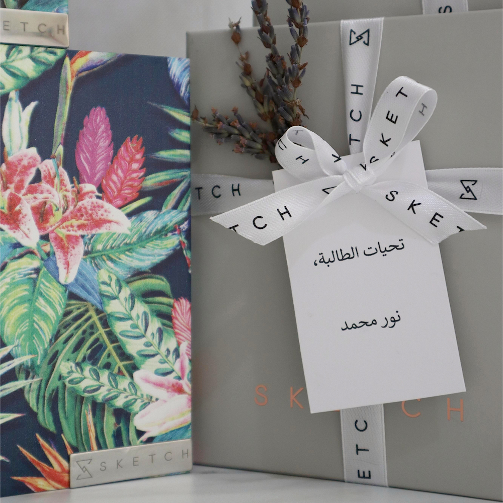 A 6 pieces modern mubkhar set in a tropical design with dried lavender giveaways with a matching cards. Mubkhar dimension: Length: 9 cm. Width: 9 cm. Height: 13 cm.