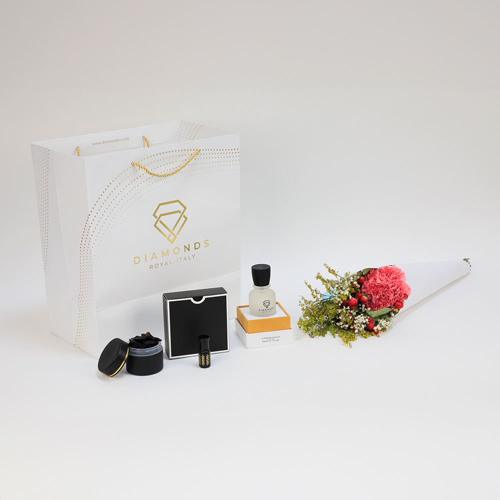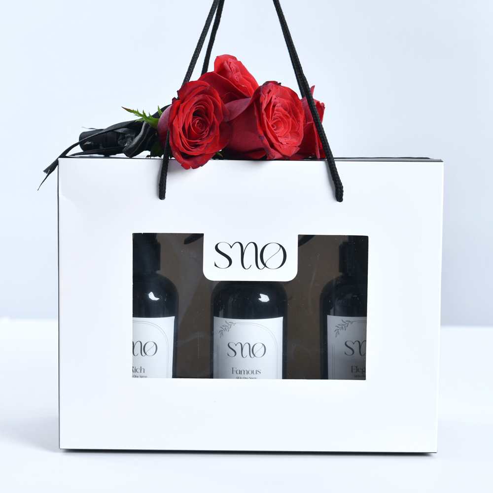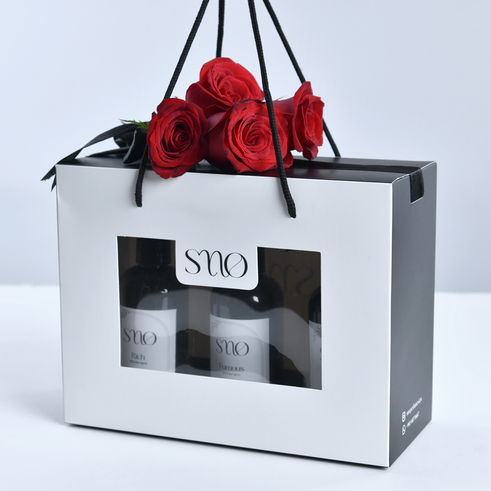 3 French sprays (250ml): Rich spray (musk, powder and vanilla). Famous spray (berries, orchid and musk). Elegant spray (rose, patchouli and musk). With red roses.