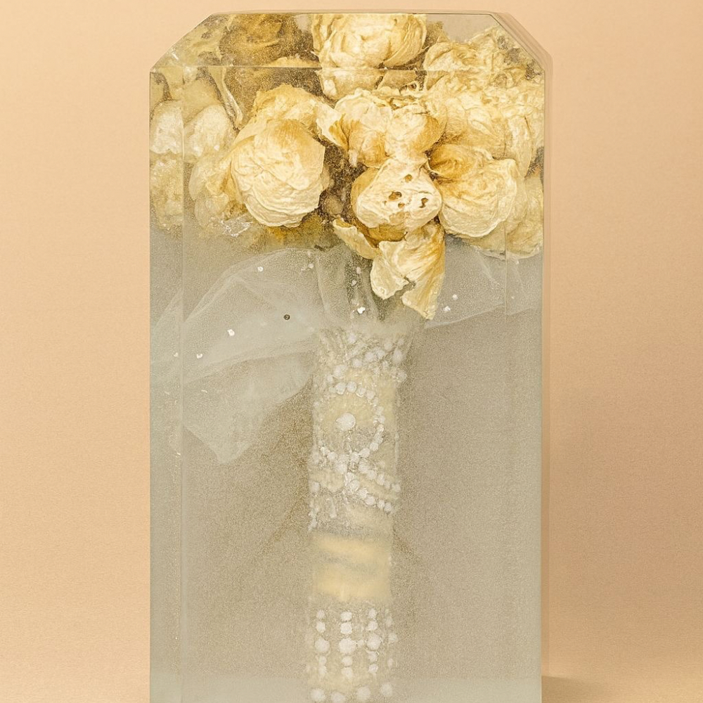 Turn your wedding memories into timeless art. Preserve your bouquet in crystal-clear resin and keep your special day alive forever.