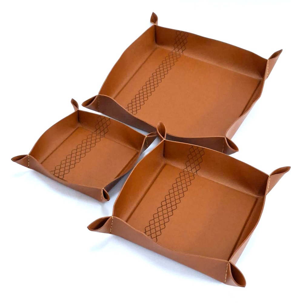 A set of 3 multifunctional light honey leather trays, perfect for your gatherings. Dimensions: - Large: 17.50 x 17.50 x 4 cm. - Medium: 12.50 x 12.50 x 4 cm. - Small: 9.50 x 9.50 x 3 cm.