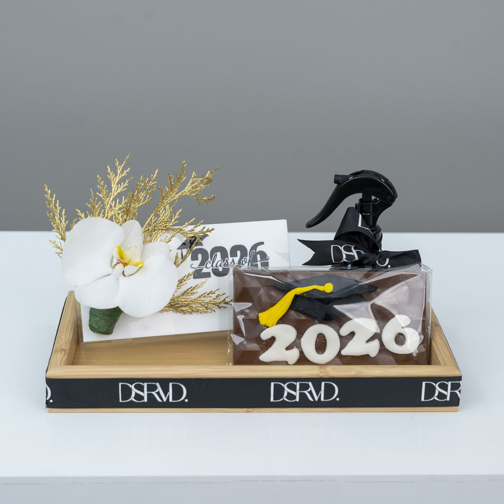 A golden tray that contains body & skin care products which moisturize and nourish dry skin. Suitable for all skin types. 1 olive oil with olive particles soap, 1 tea tree oil soap, 1 olive body scrub peeling, 1 clay extract face mask and 1 almond skin cream. Animal cruelty-free, without SLS, SLES and parabens.
