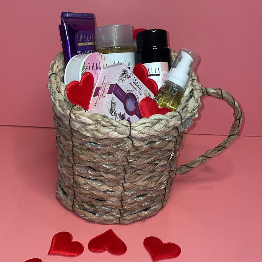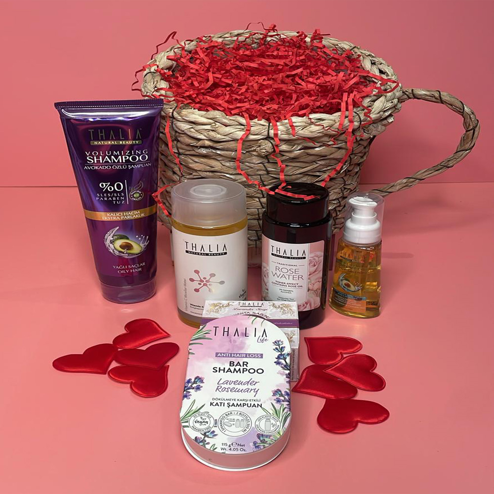 The love cup: A treasure trove of botanical hair and skincare luxuries nestled in a rustic wooden cup. Each item is a pledge of affection and care: avocado shampoo for balancing oily hair, rose water to soothe and refresh, a lavender & rosemary shampoo bar for serene cleansing, Vitamin C micellar water for a brightened complexion, avocado hair oil for deep nourishment, and a calming lavender soap. This collection is a heartfelt embrace of the senses, an ideal expression of love for oneself or someone special.