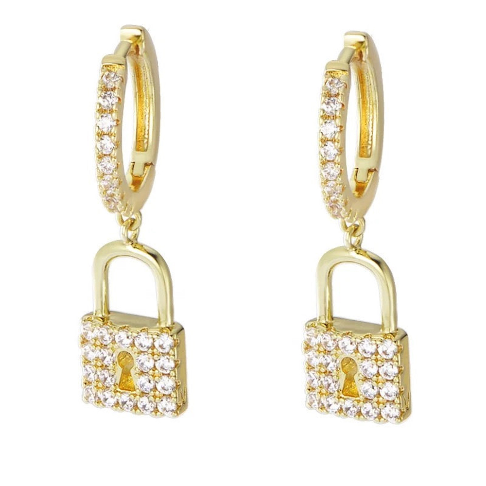 A collection featuring a padlock necklace and matching earrings, crafted from high-quality 18K stainless steel with a zircon clear stones pendant. Waterproof and tarnish-free for long-lasting shine.