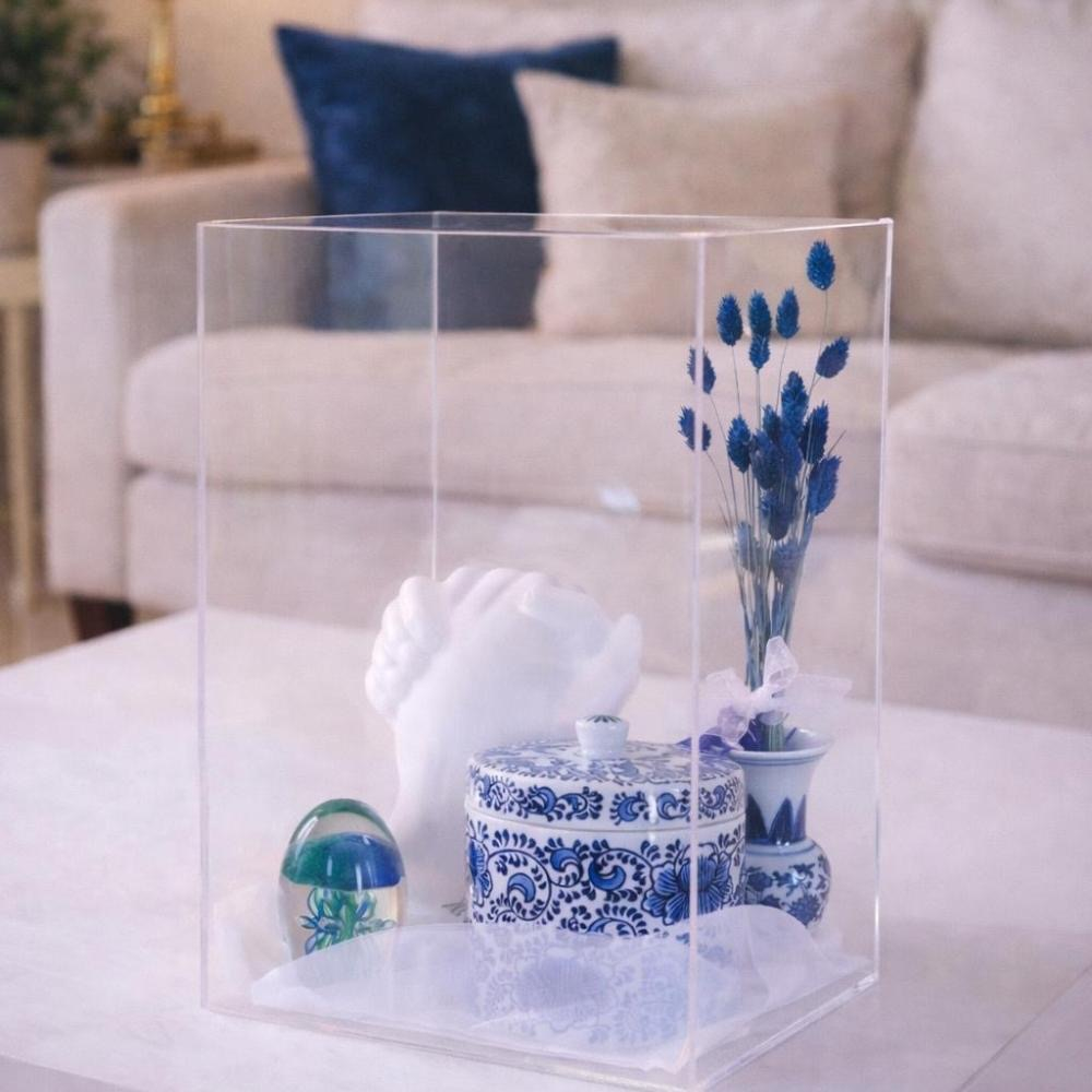 A clear acrylic box featuring an exquisite hand ceramic figurine paired with a small blue vase and empty jar plus a distinctive oval glass decoration, perfect for gifting.