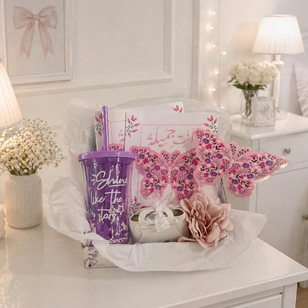A special box that contains two pieces of our special notebook, a white mini bag, a cute tumbler, and a special butterfly gift.