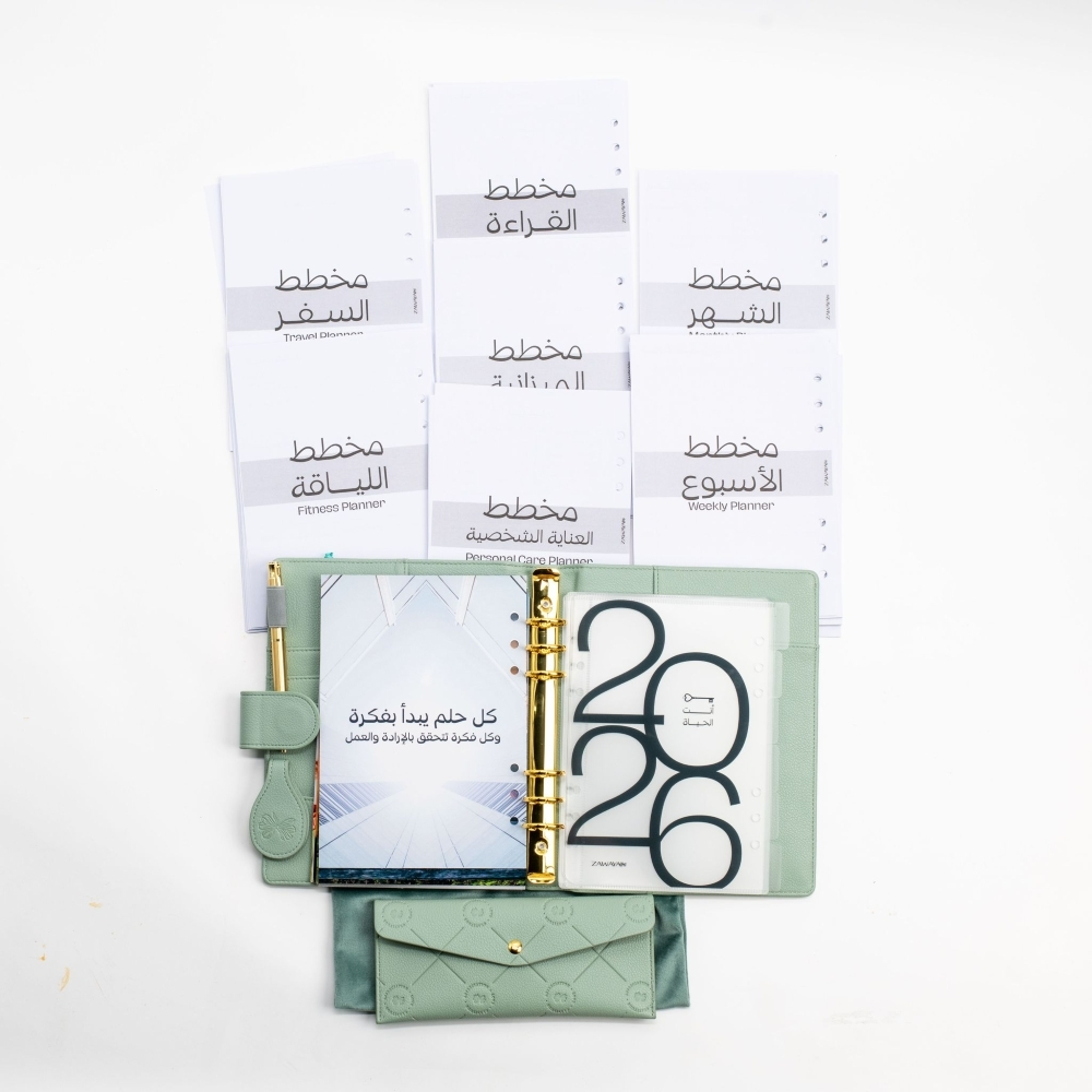 Zawayas balance set is your all in one collection designed to bring harmony between work and life productivity and rest, bringing together planning tools that cover every area of your day from health and budgeting to travel and personal care, giving you clarity structure and a smoother planning experience throughout the year, with a premium vegan leather cover with gold rings, fitness planner a5, budget planner a5, monthly planner a5, self care planner a5, travel planner a5, weekly planner a5, reading planner a5, savings envelopes, acrylic planner accessories, motivational dividers and a gold ink pen.