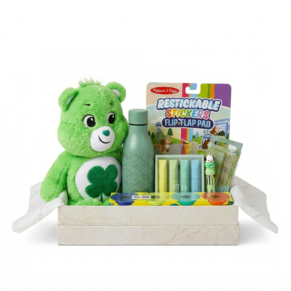 A teddy activity box with simple creative items, contents teddy colors tools, age 3 plus.