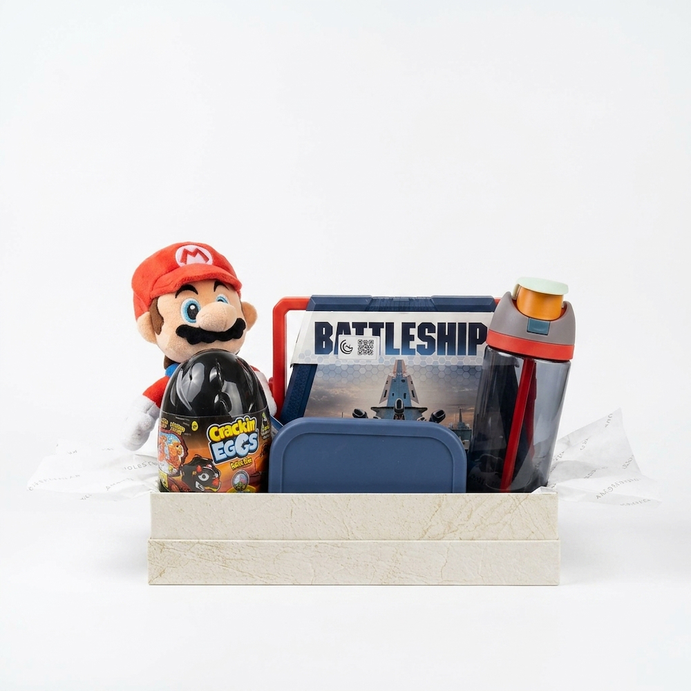 A thoughtfully arranged kids gift box combining a plush character toy, a strategic board game, a leak proof water bottle, a practical lunch box, and a surprise egg toy, the set balances imaginative play group interaction and daily utility, what’s inside plush character doll mario style soft fabric with embroidered facial details, battleship board game standard set with pegs grids and rules, leak proof water bottle with straw and removable parts for cleaning, plastic lunch box food container with secure lid, surprise crackin egg toy capsule containing small collectible or assembly pieces, protective inner wrapping inside the gift box, materials and specifications credibility plush polyester outer fabric fiberfill stuffing reinforced seams height approx 25 to 30 cm confirm exact measurement on request, battleship plastic pegs game boards and printed instruction sheet check factory packaging for full age and contents details, bottle bpa free plastic indicated on label verify on receipt capacity 400 to 600 ml removable straw and lid components for hygiene, lunch box durable food safe plastic with secure closure medium size suitable for a child’s meal, surprise egg plastic capsule packaging with small toy parts includes recommended age warning on packaging, age recommendation and safety generally suitable for children aged 3 years and above the surprise egg and some game pieces contain small parts adult supervision required, always verify age warnings and safety labels on each packaged item upon receipt, how to use plush for cuddling and imaginative play, battleship for family or group gameplay that encourages strategy and turn taking, use the lunch box and bottle for school or outings wash after each use, open the surprise egg carefully and store small pieces out of reach of very young children, care and cleaning plush surface clean with a damp cloth and mild detergent follow care label if hand washable do not tumble dry unless label permits, bottle and lunch box wash in warm soapy water disassemble lids and straws for thorough cleaning, game components wipe plastic parts keep paper elements dry, additional credibility notes check manufacturer labels and safety instructions on arrival to confirm authenticity and age guidance, exact item dimensions plush height bottle capacity lunch box dimensions are available on request to ensure fit and expectations before purchase.