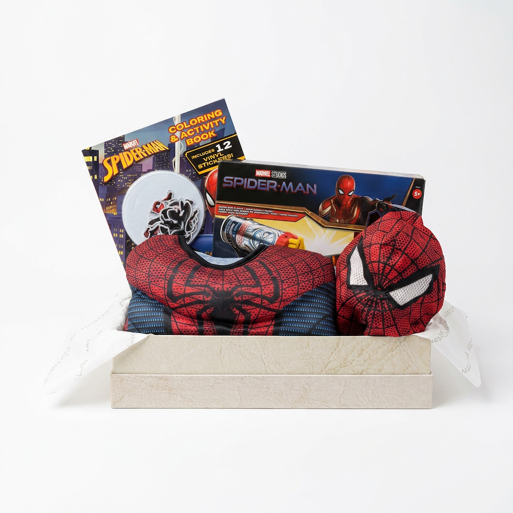 A complete spider man inspired costume set featuring a padded torso piece to simulate muscle definition, a padded face mask, a small toy accessory such as a play blaster, and a spider man coloring activity book, available in one size only small, designed for a realistic look and comfortable wear for younger children with attention to safety and authenticity, what’s included full costume top or padded chest piece printed with spider man design with light foam or fiberfill padding, padded face mask with eye and nose openings, small toy accessory packaged as shown in imagery, spider man coloring and activity book, internal protective wrapping for secure shipping, materials and construction credibility fabric printed cotton polyester blend padding light foam or fiberfill for shape, mask lightweight polyurethane or plastic with a soft inner lining for comfort, games toys and activity book are standard retail items verify manufacturer labeling and age recommendations on receipt, reinforced stitching at stress points for reliable family use, sizing and fit size one size small only typically suitable for children approx 3 to 5 years or heights roughly 95 to 110 cm depending on build, for accuracy detailed measurements chest width back length sleeve length garment length are available on request to ensure proper fit, how to use put on the costume and secure internal ties or fasteners for a comfortable non restrictive fit, wear the mask only after confirming eye and breathing openings provide clear vision and ventilation, use activity book and toy accessory under adult supervision after dress up play, care and safety recommended age generally 3 years and above confirm age guidance on toy packaging some accessories may contain small parts, do not leave child unattended while wearing mask or costume during active play, keep away from open flames and heat sources, cleaning hand wash fabric pieces in cold water with mild detergent air dry away from direct sunlight wipe mask and plastic parts with a damp cloth and mild soap, inspect seams and attachments regularly discontinue use if any component becomes damaged or loose, additional notes for reliable fit measure the child and request the detailed garment dimensions before purchase, check packaging and manufacturer labels on arrival to confirm authenticity and safety compliance.