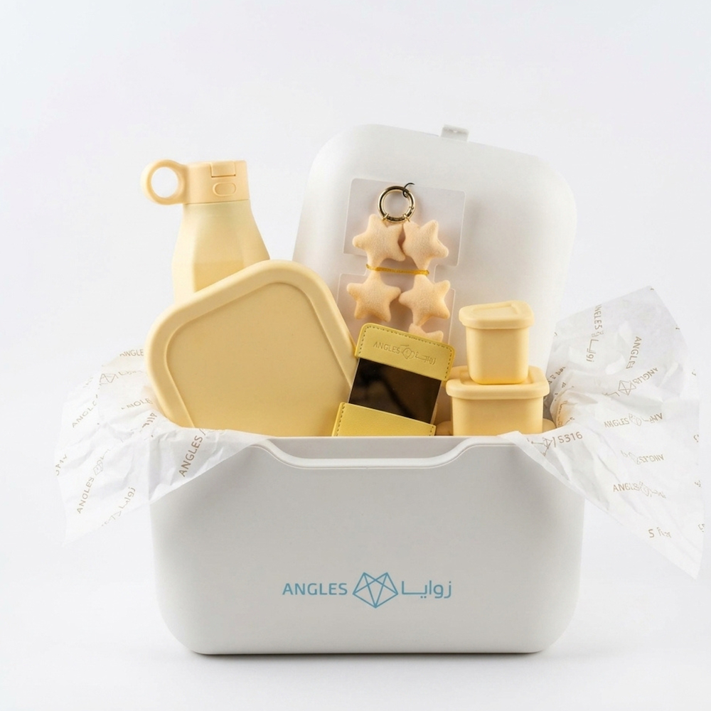 A practical, everyday gift set designed to organize snacks in a safe and modern way for children. Contents: - A star-shaped phone strap. - A small mirror. - A silicone food container. - Small silicone snack containers. - A silicone water bottle. - An insulated ice box.