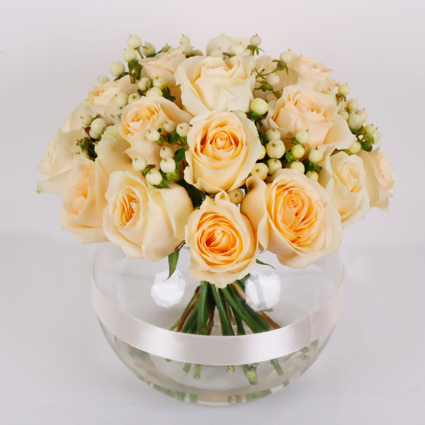 A peach-colored roses and delicate hypericum berries, elegantly presented in a classic vase.