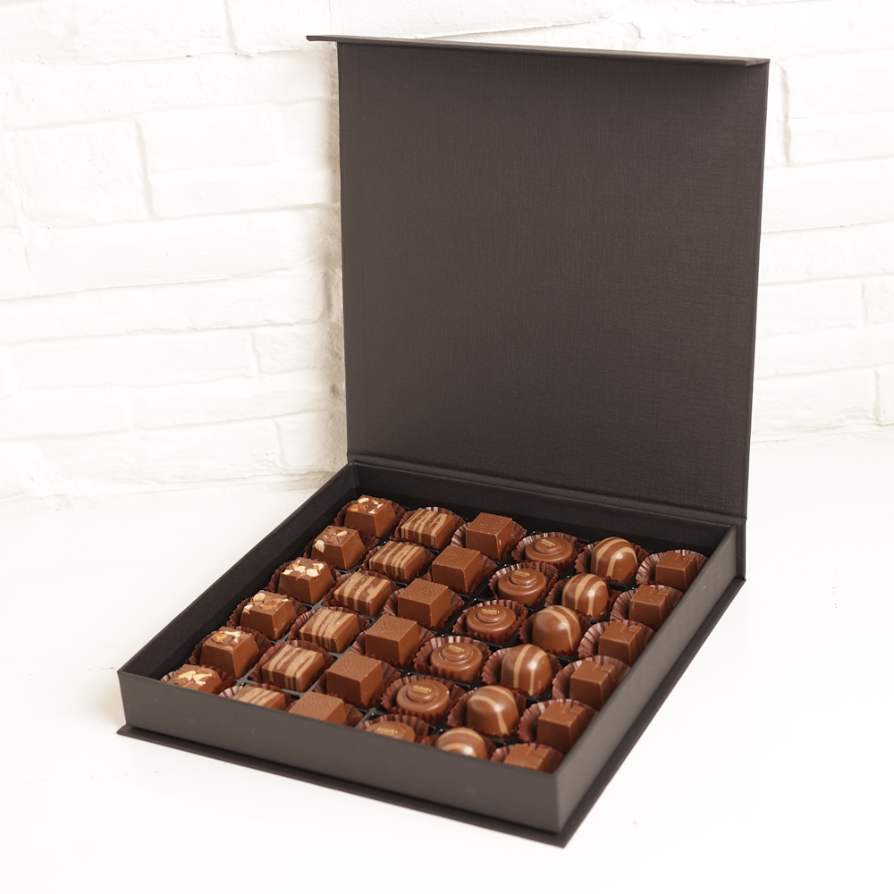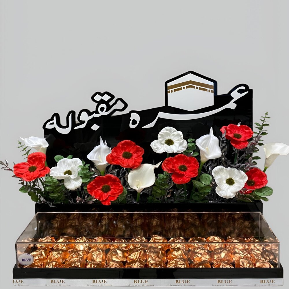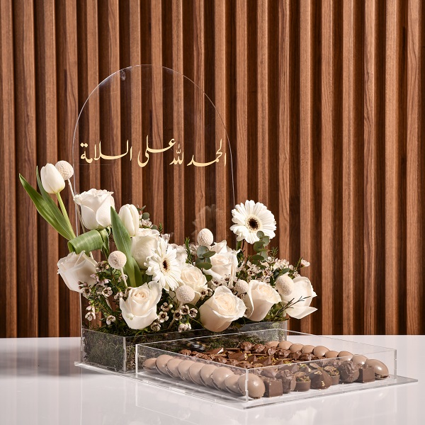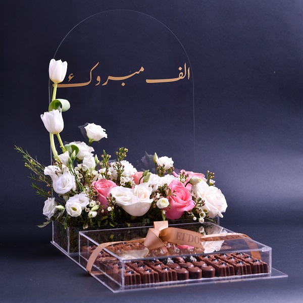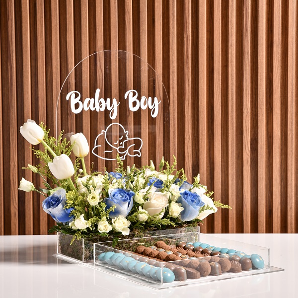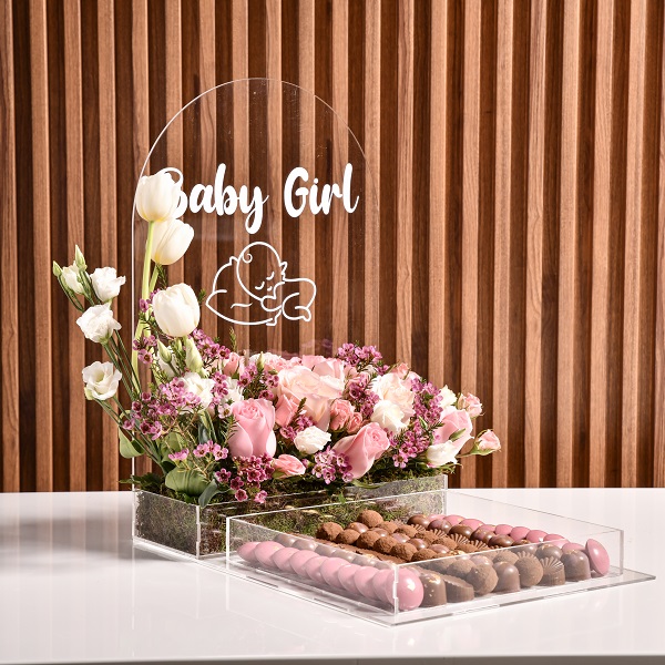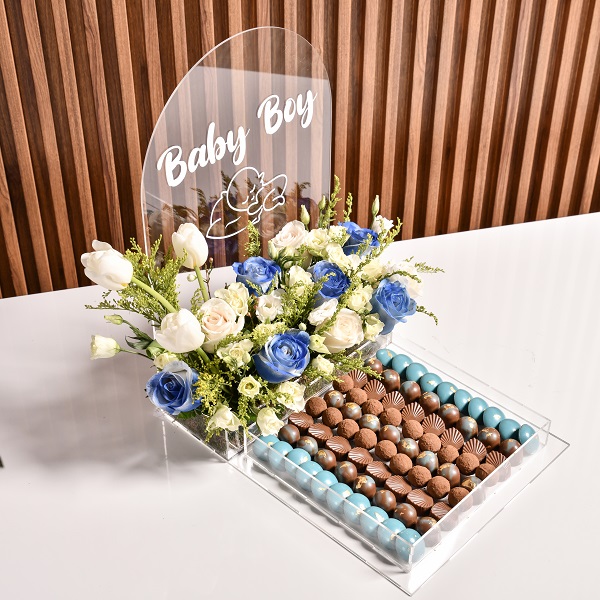 970 grams of luxurious Belgian chocolates in an acrylic box with an acrylic stand decorated with flowers and a sticker that says: “congratulations to the newborn”.