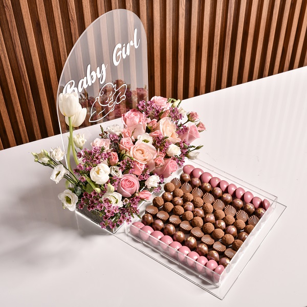 970 grams of luxurious Belgian chocolates in an acrylic box with an acrylic stand decorated with flowers and a sticker with the phrase “congratulations for the newborn”.