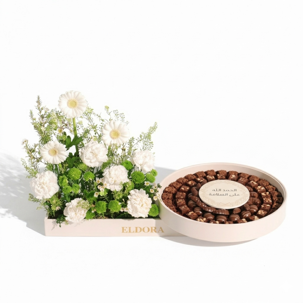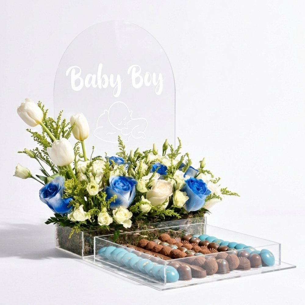 970 grams of luxurious Belgian chocolates in an acrylic box with an acrylic stand decorated with flowers and a sticker that says: “congratulations to the newborn”.
